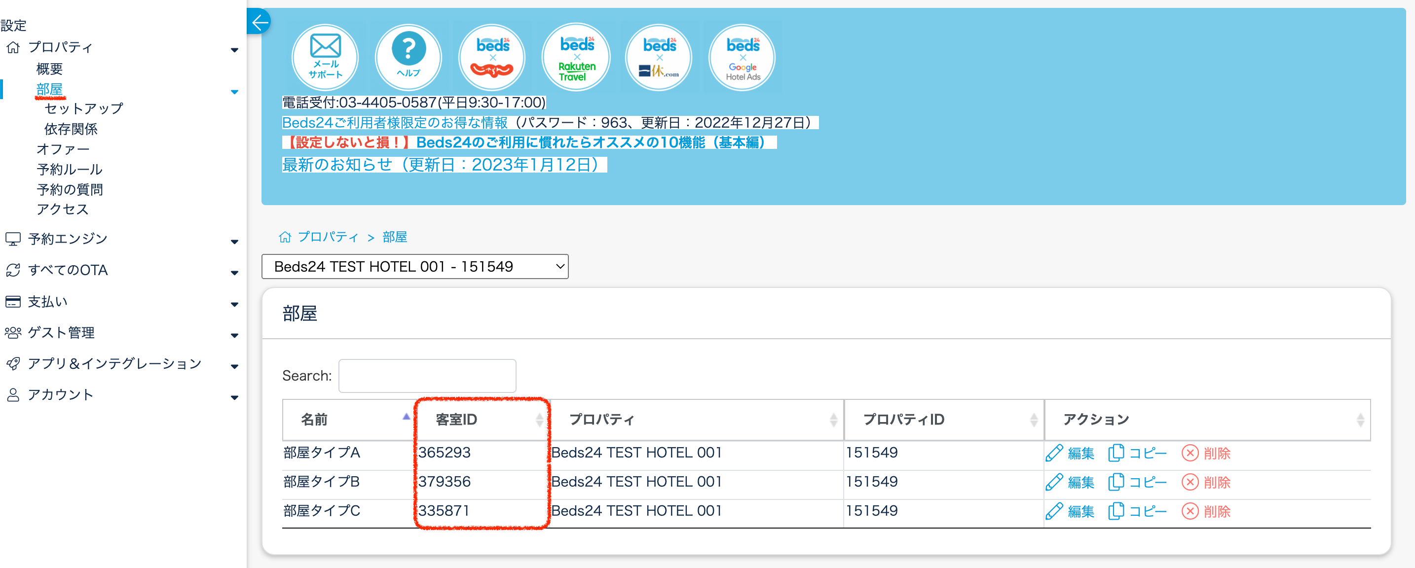 ※Beds24の客室IDは、プロパティ > 部屋で確認してください。