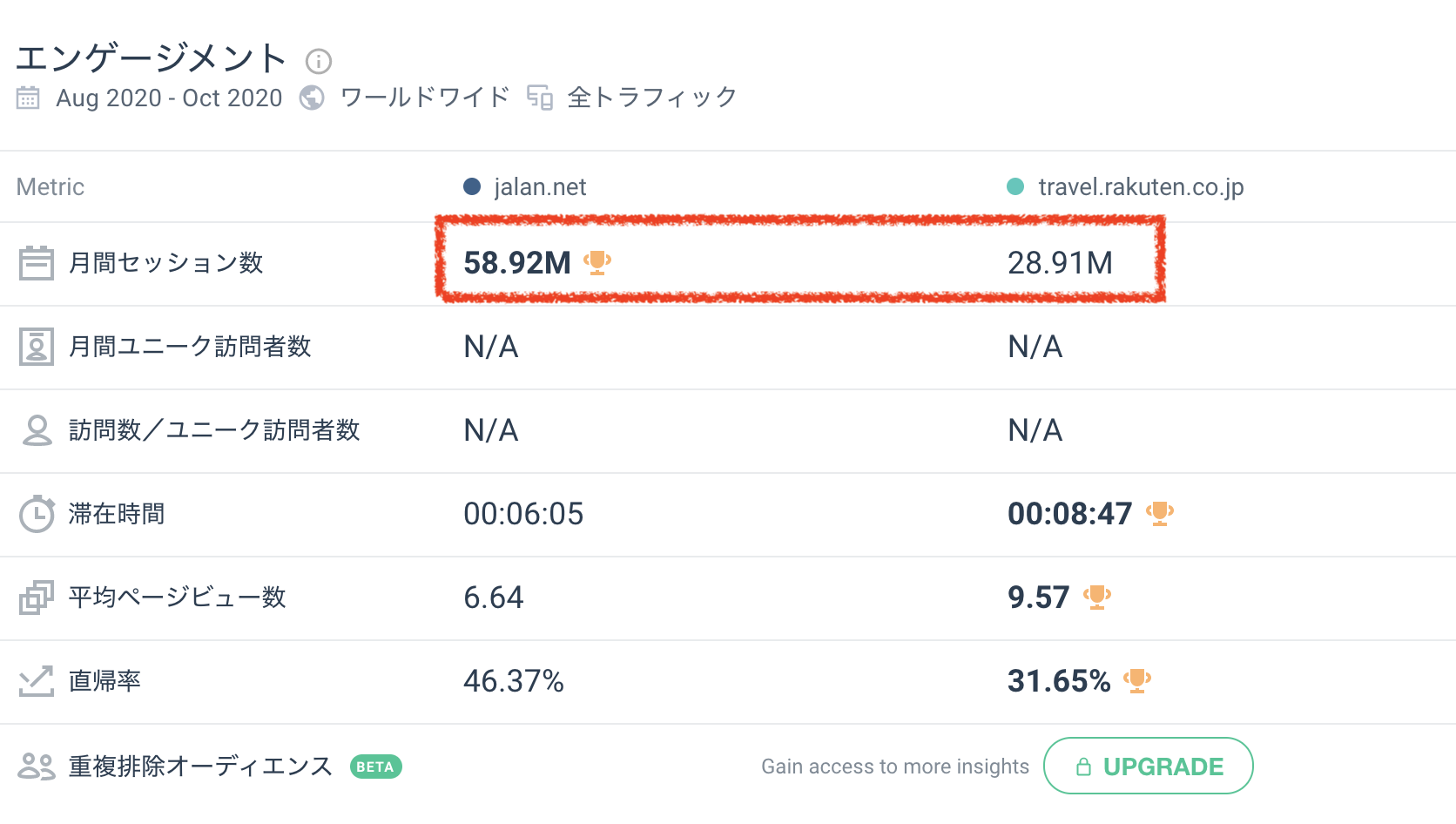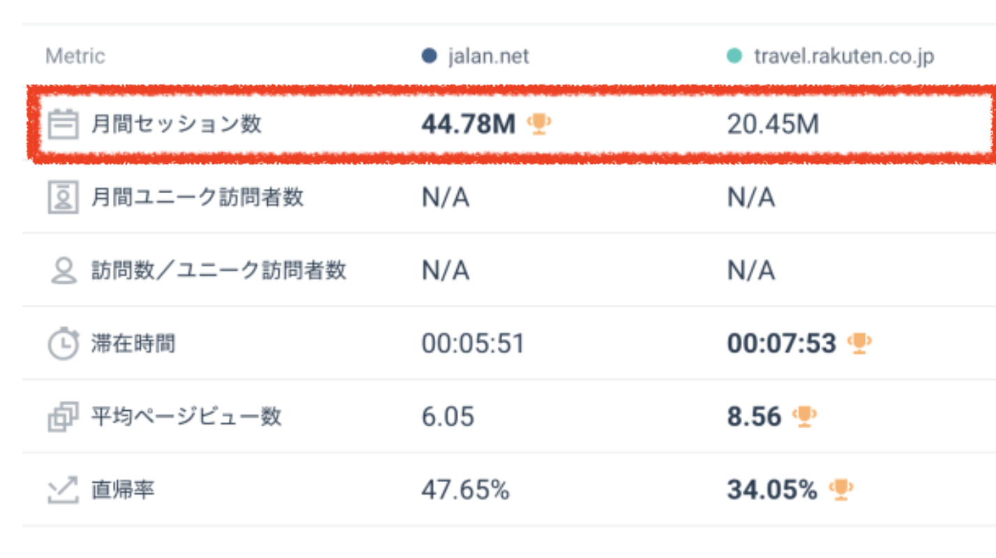楽天トラベルのセッション数(サイト訪問数)は、じゃらんの45.66%(=20.45百万/44.78百万)でした。