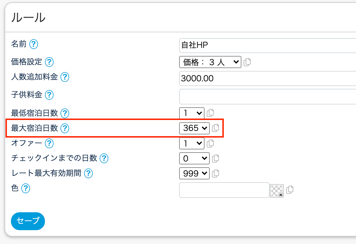 ※最大宿泊日数もBeds24上にいくつか設定箇所があります。最低宿泊日数同様に、①セットアップ、②日別料金、③カレンダーのいずれかで設定をお願いします。