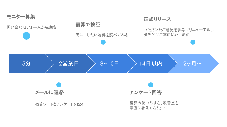 - 問い合わせフォーム にて「宿算モニター希望」と送信