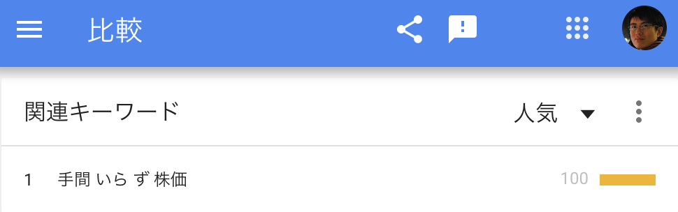 グーグルトレンドでは、「手間いらず」というキーワードに付随して、「株価」というキーワードもよく検索されてることが、以下の画像の表に表示されます。