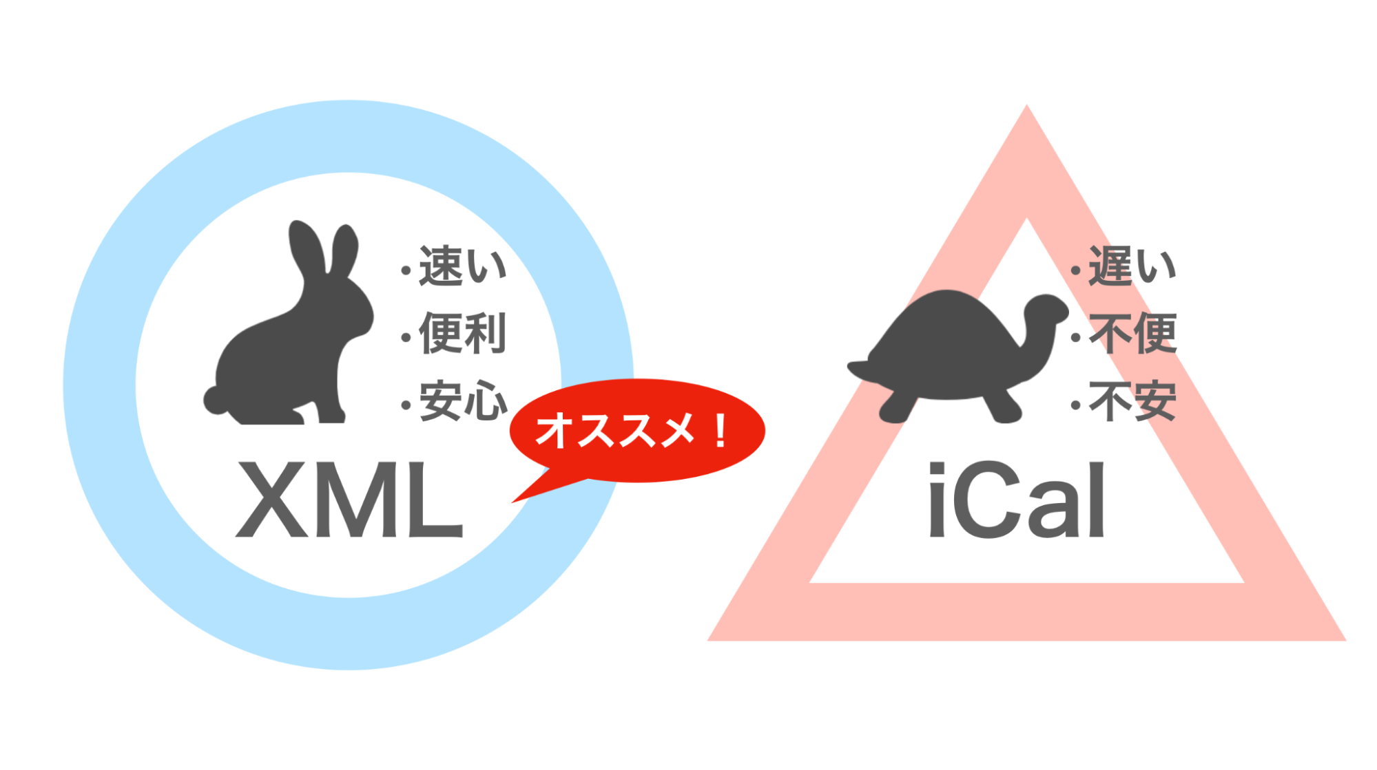 同期速度はXMLが1分、iCalが15分〜8時間と大きく差があります。