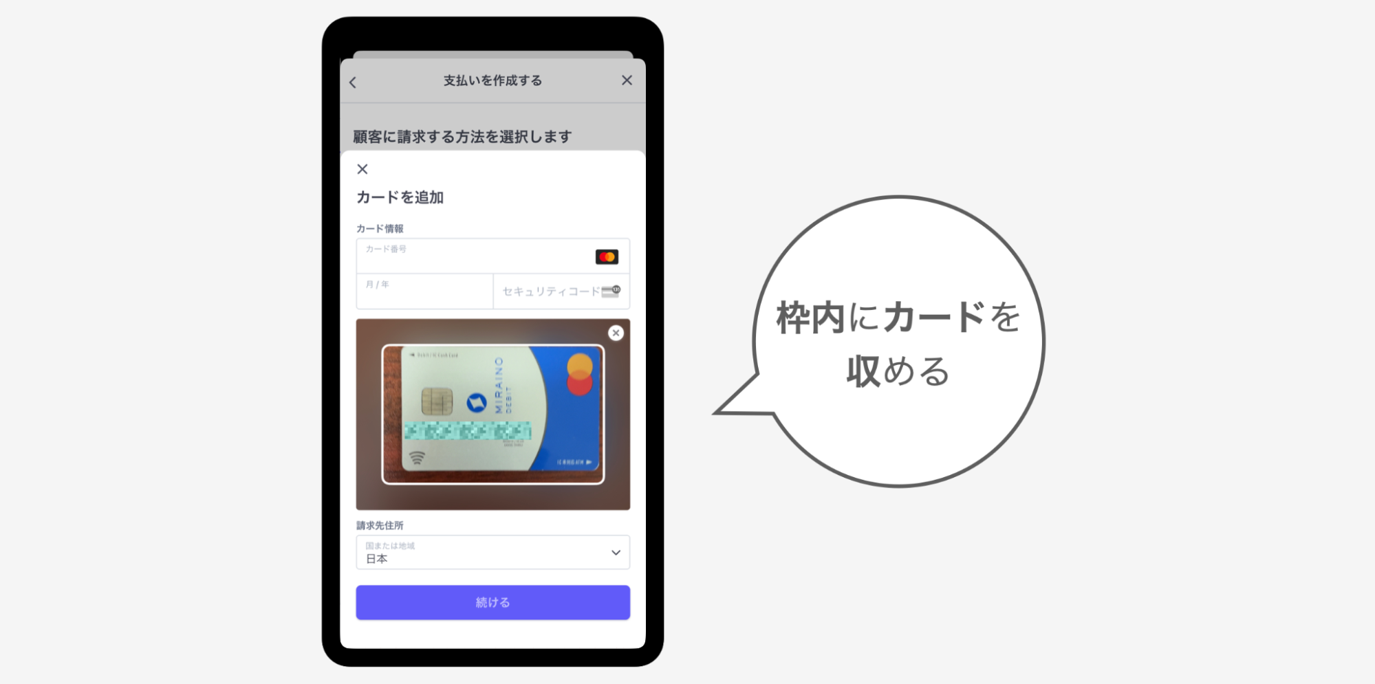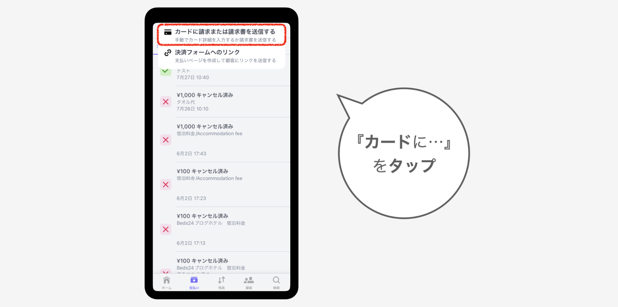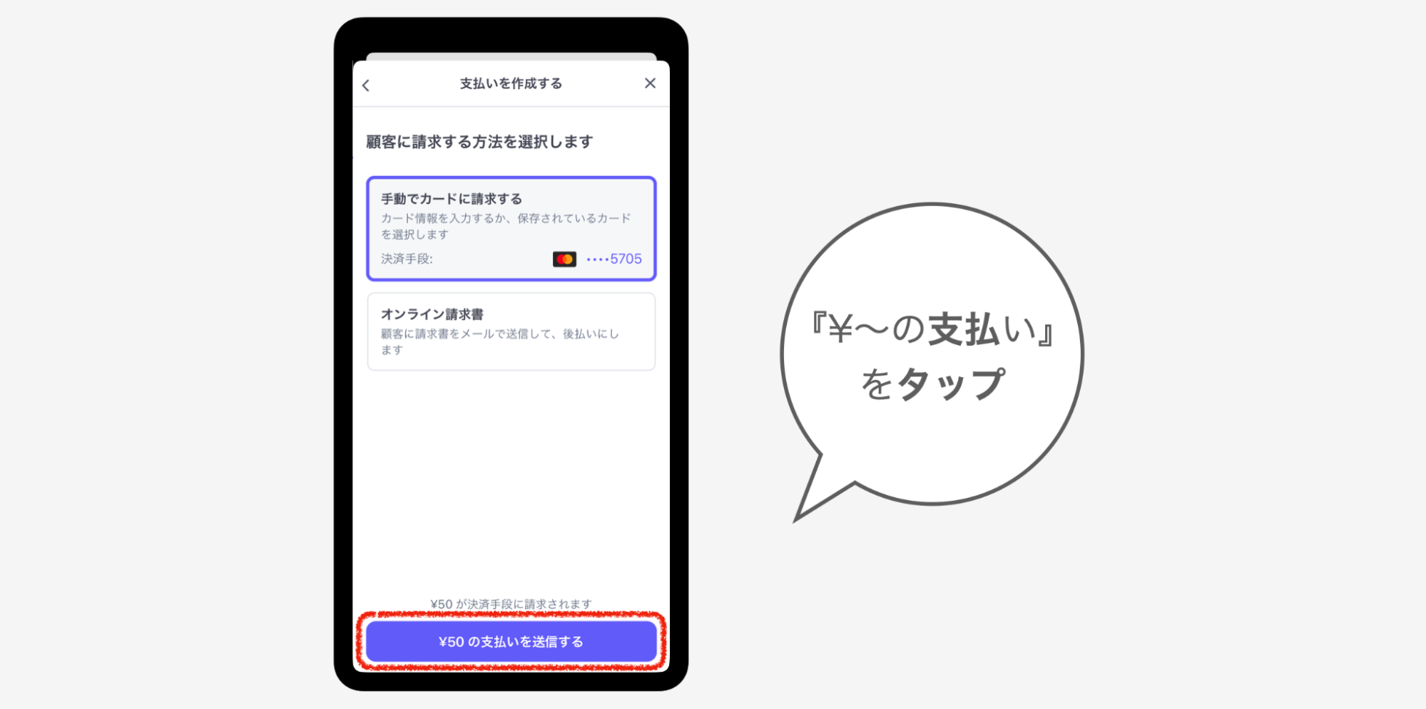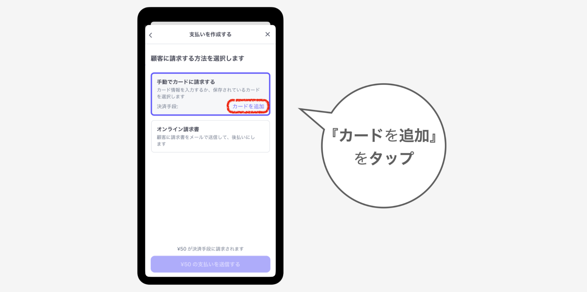 ②『カードに請求または請求書を送信する』をタップ