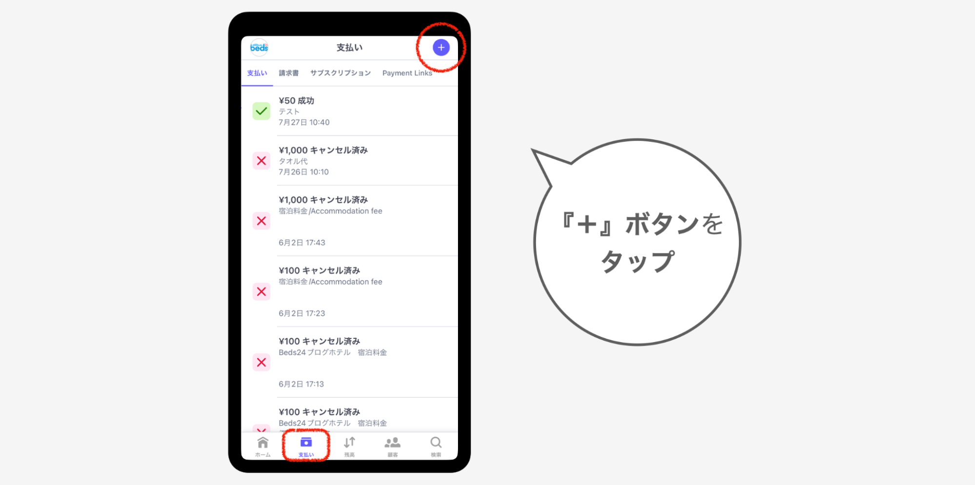 ①支払いの画面で『+』ボタンをタップ