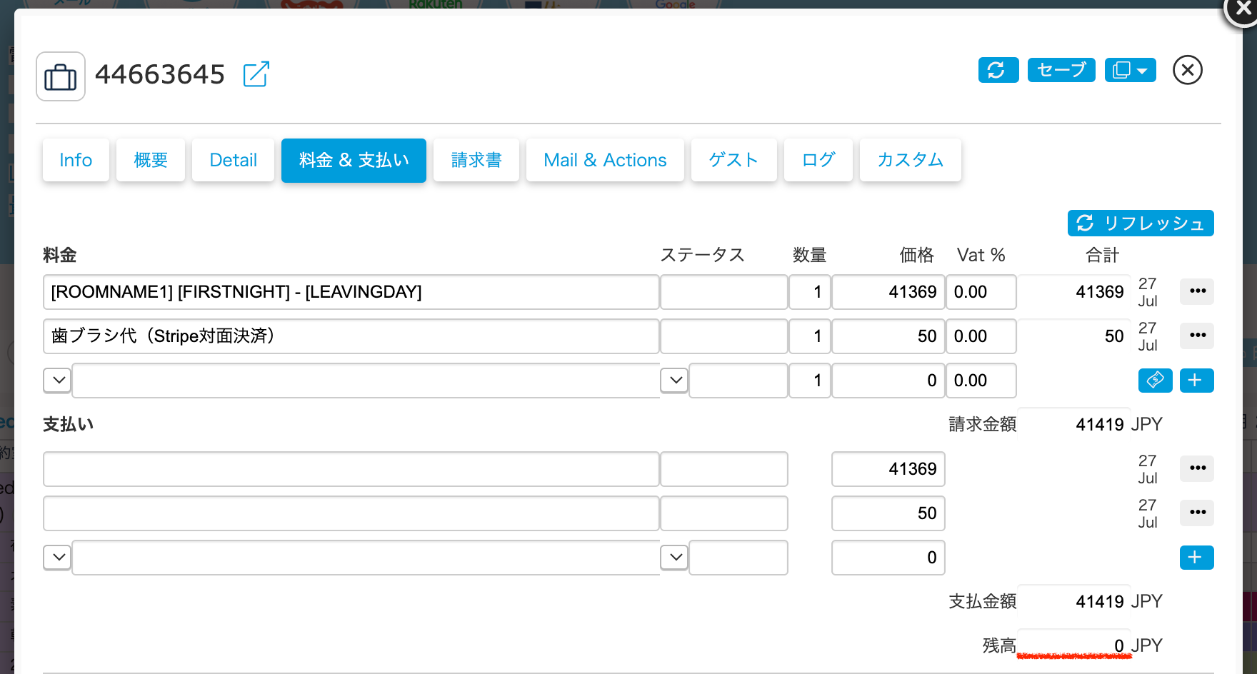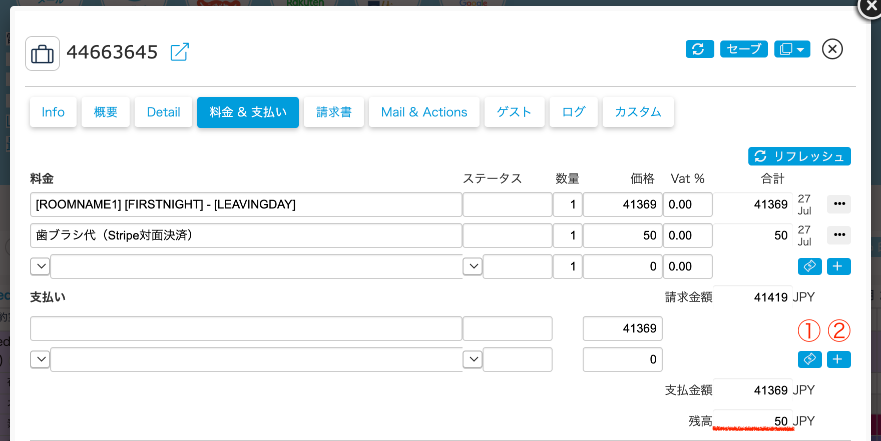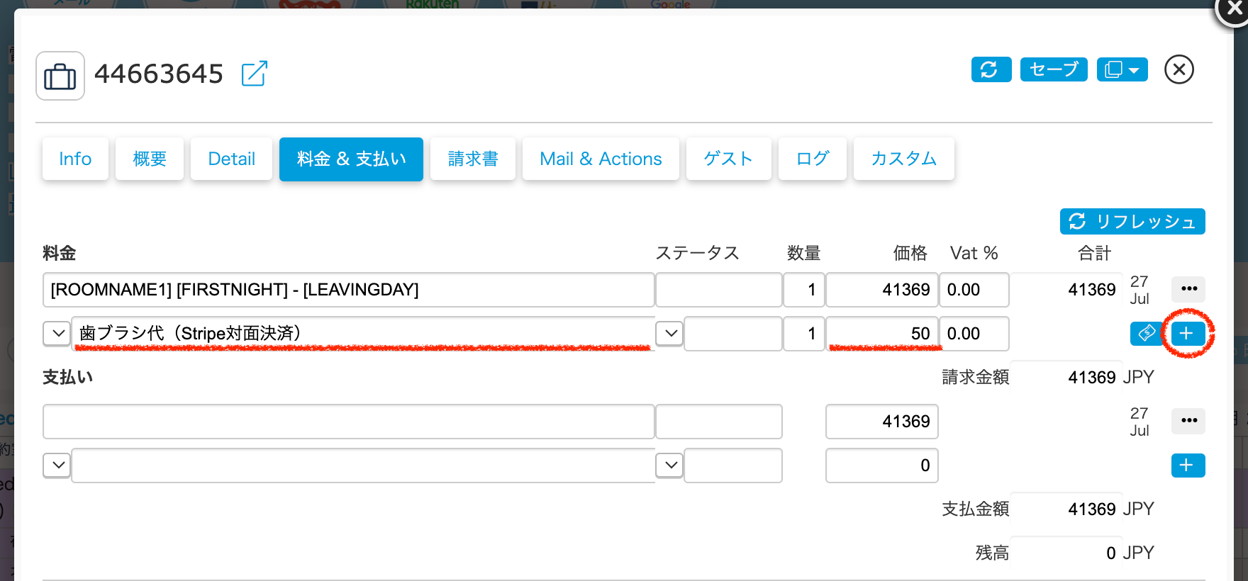 ①該当予約の『料金&支払い』タブの”料金”に内容と金額を追加