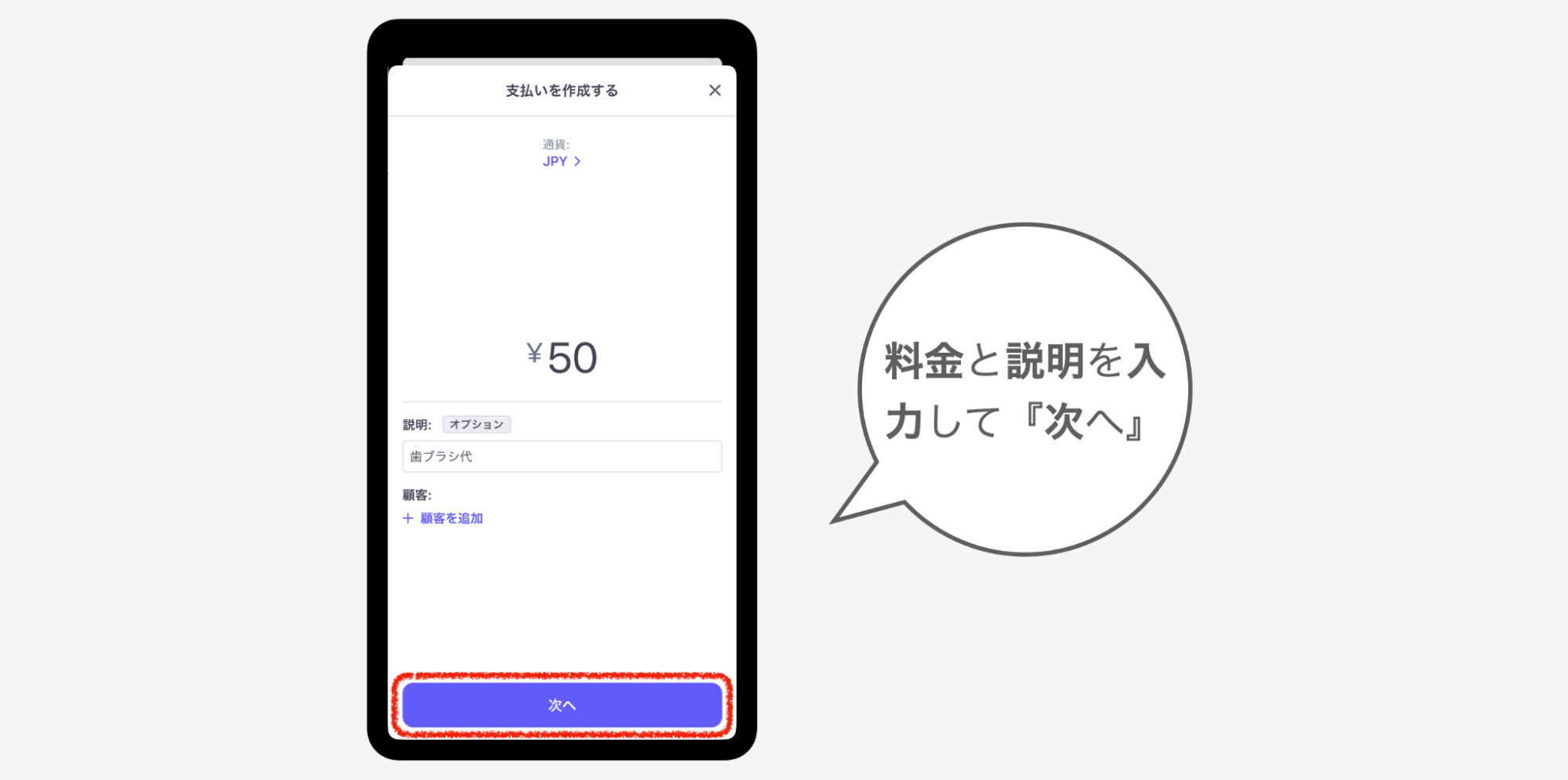 ③料金と詳細(支払い内容)を入力し、『次へ』をタップ
