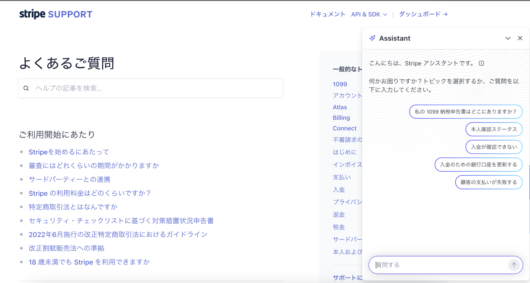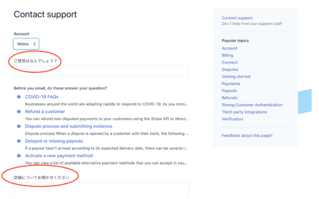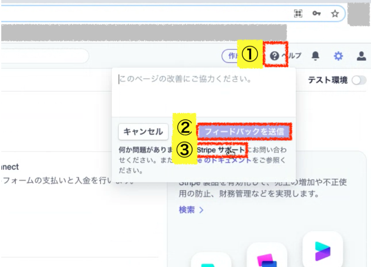 1.Stripeホーム画面 > 右上?のアイコン >フィードバッグを送信>Stripeサポートをクリックします。