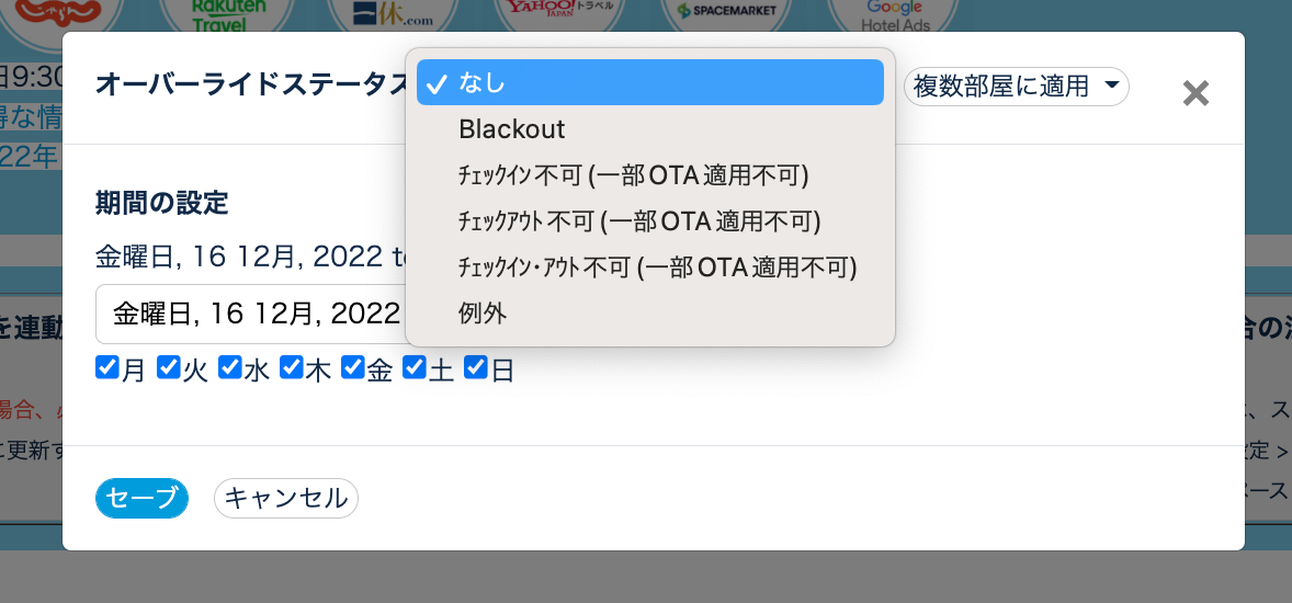 しかし、これらの設定はBooking.com、Airbnb、Expedia、Beds24の自社HPでは機能しますが、VacationSTAY・楽天トラベル・じゃらんなど一部OTAには機能致しません。
