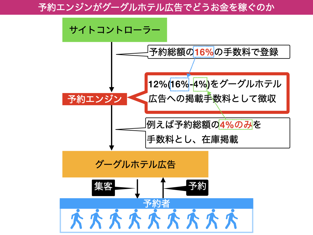 例として、宿(サイトコントローラー側)が登録した16%の手数料から、12%の手数料を予約エンジンの会社が利益として、獲得し、4%の費用をグーグルに支払っています。