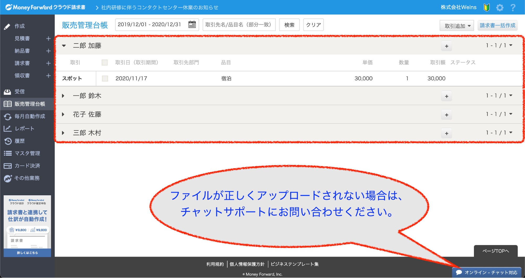 ※ファイルがうまくアップロードされない場合は、マネーフォワード管理画面右下のオンラインチャットから問い合わせてください。