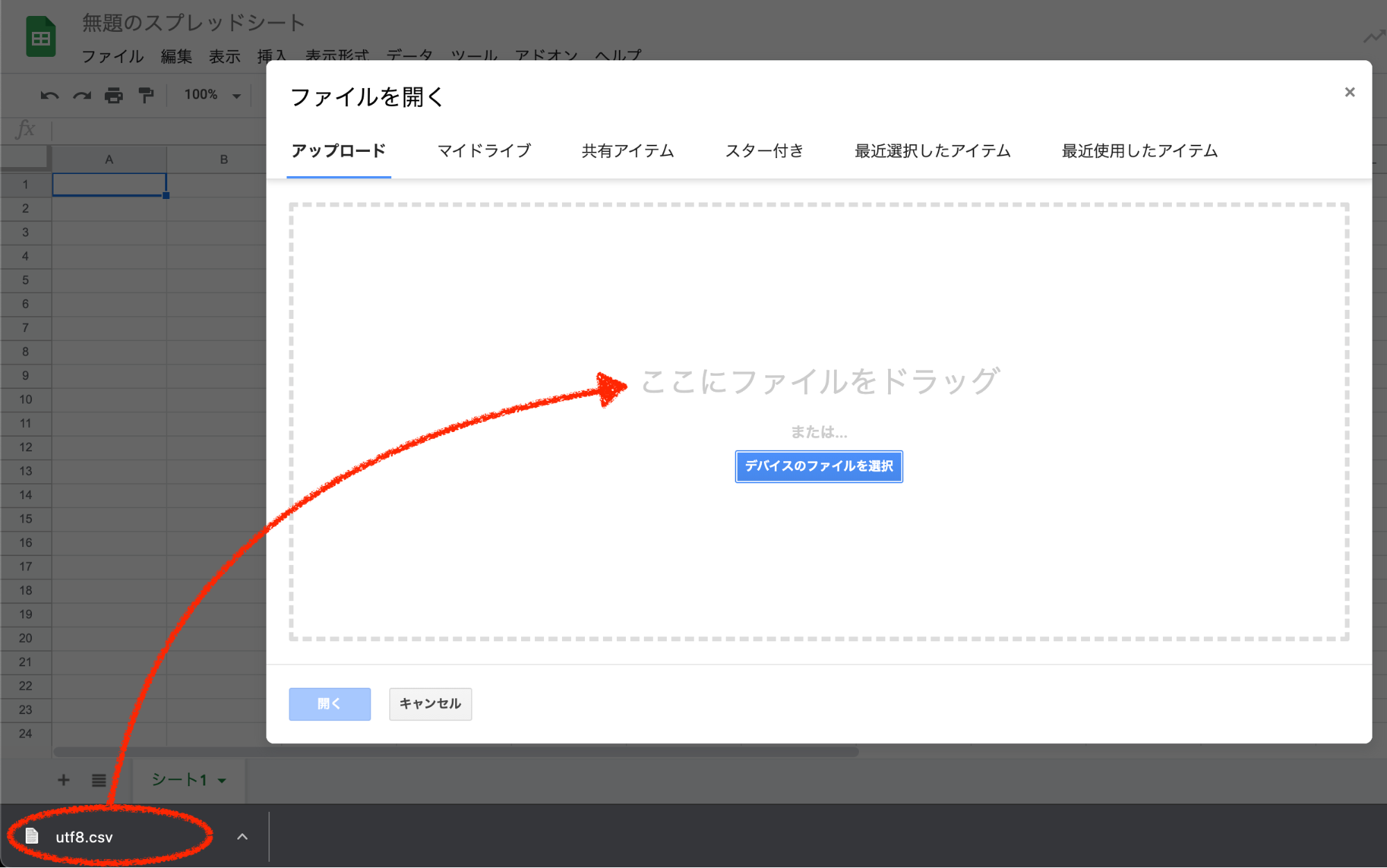 8.スプレッドシートでダウンロードしたcsvファイルを開きます。