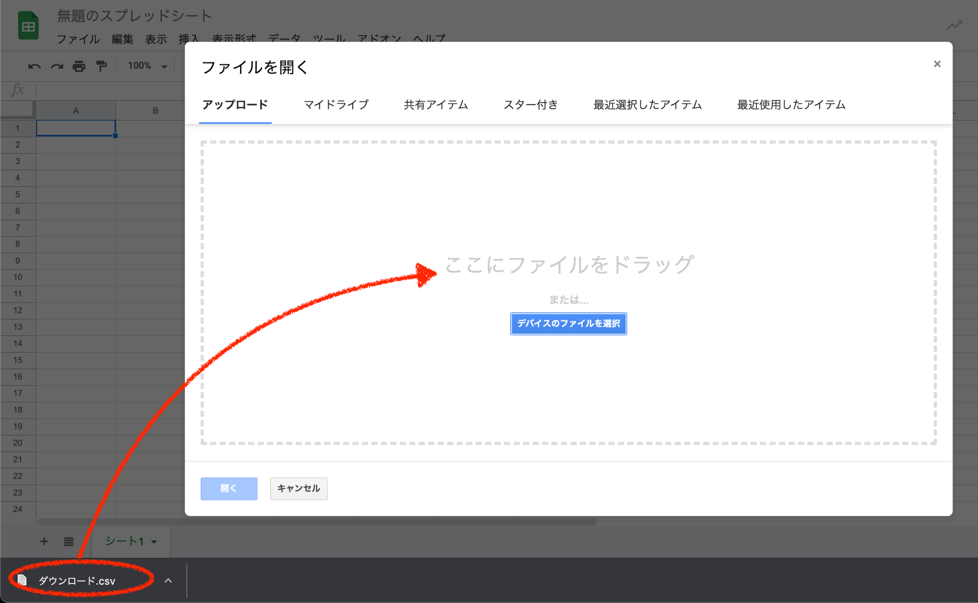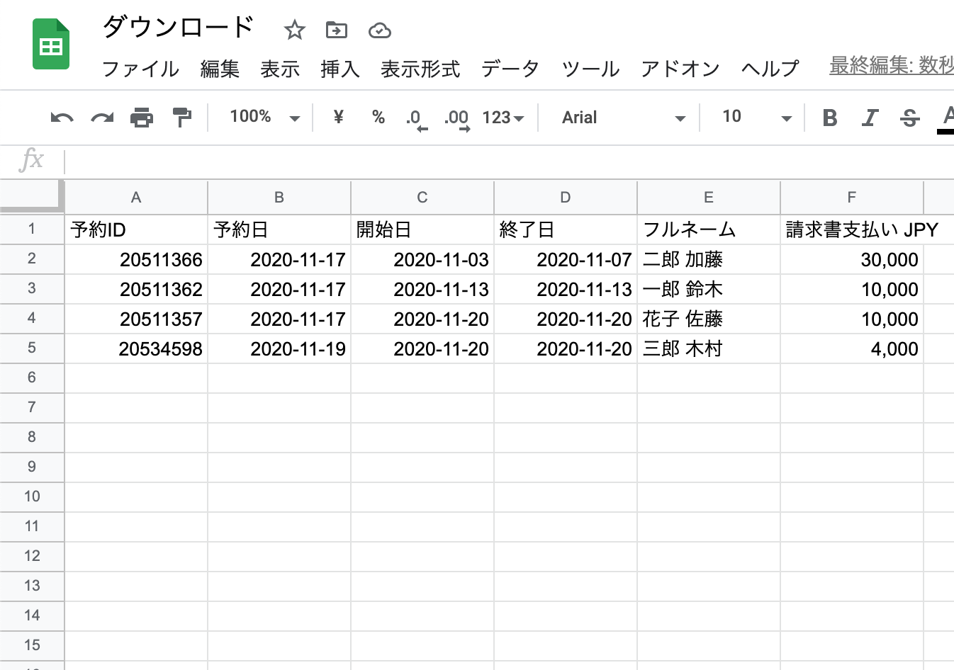 3.スプレッドシートでダウンロードしたcsvファイルを開きます。