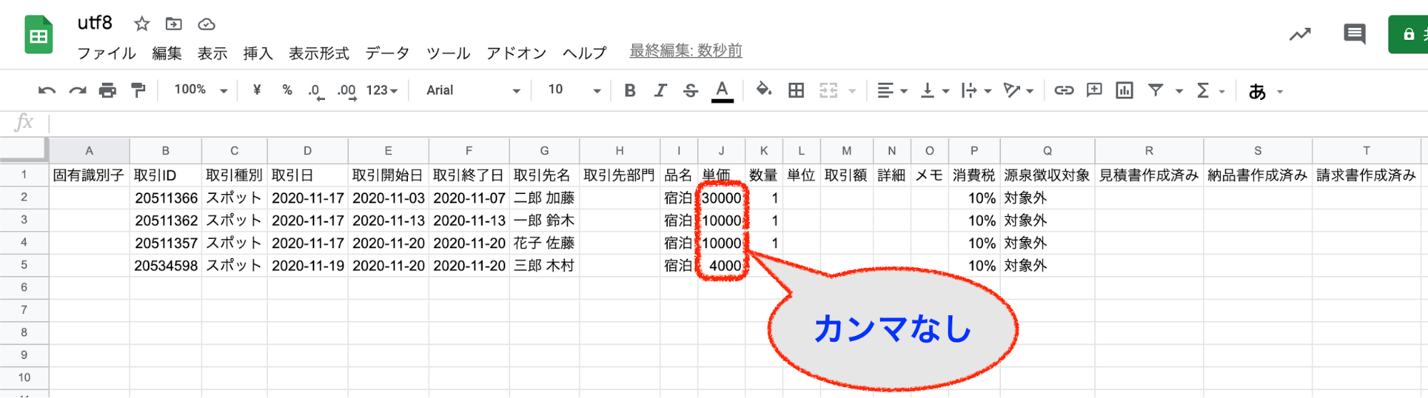 • J列:単価に「請求書支払い JPY」を貼り付けます。カンマが自動入力された場合は、カンマなしの表示形式に変更してください。