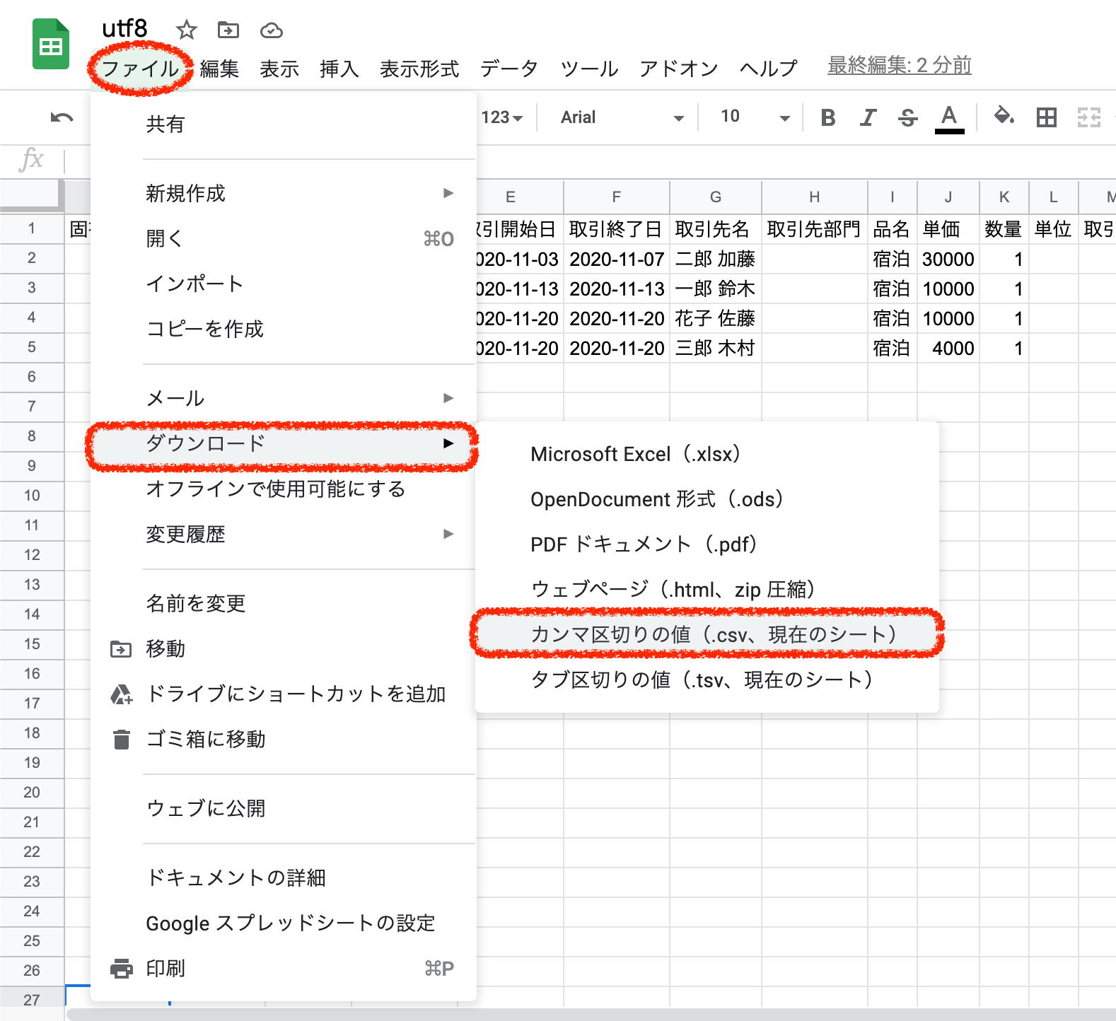 3.編集が完了したスプレッドシートをcsvでダウンロードします。