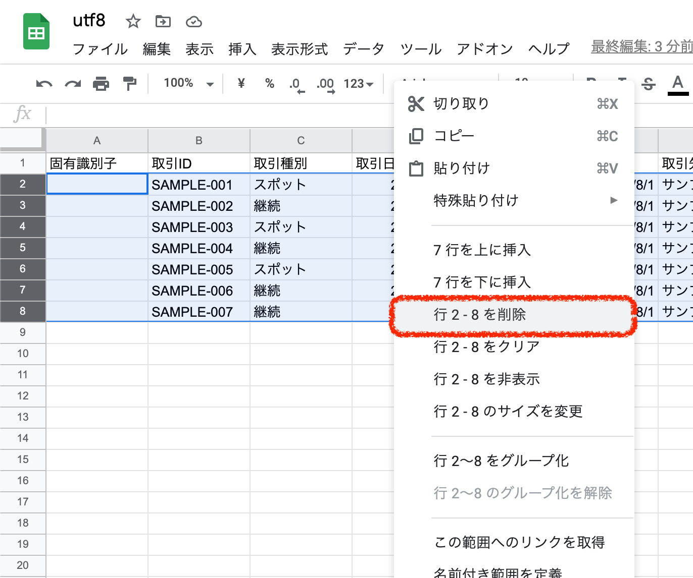 4.記入例が入力されている2〜8行目を削除します。
