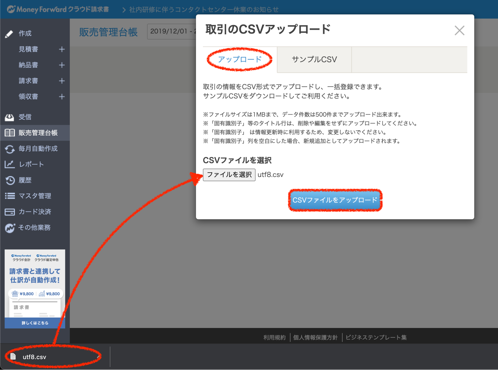 1.マネーフォワード管理画面 > 販売管理台帳の画面で、取引追加 > CSVアップロードをクリックし、ポップアップからcsvファイルをアップロードします。