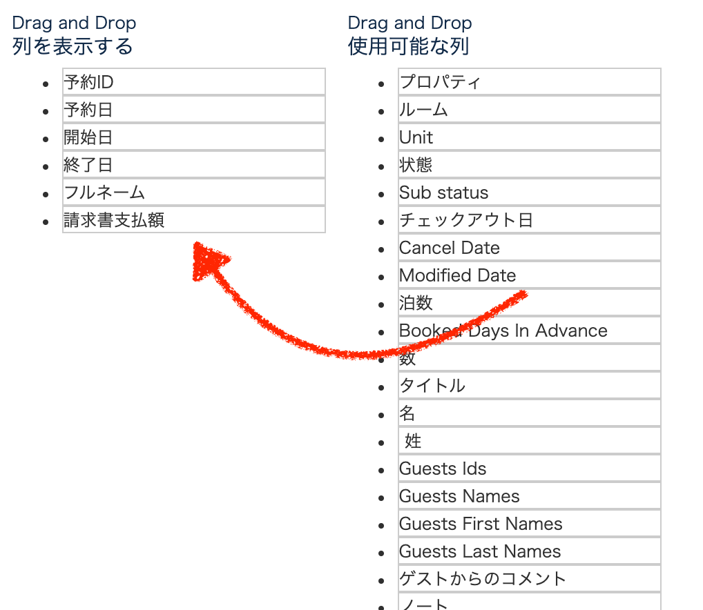 4.「列を表示する」に画像の項目をドラッグ&ドロップで設定します。