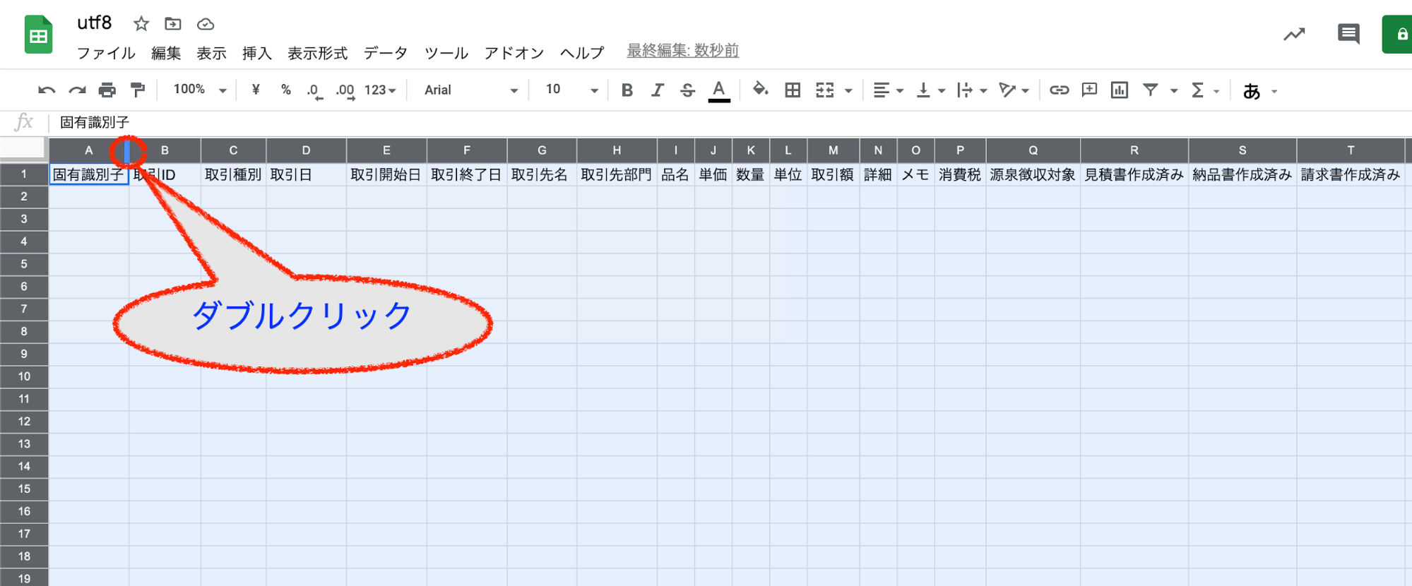 1.サンプルシートを見やすくするために、スプレッドシートを全選択し、画像の赤丸の箇所(A列とB列の境目)をダブルクリックして列の幅を狭めます。
