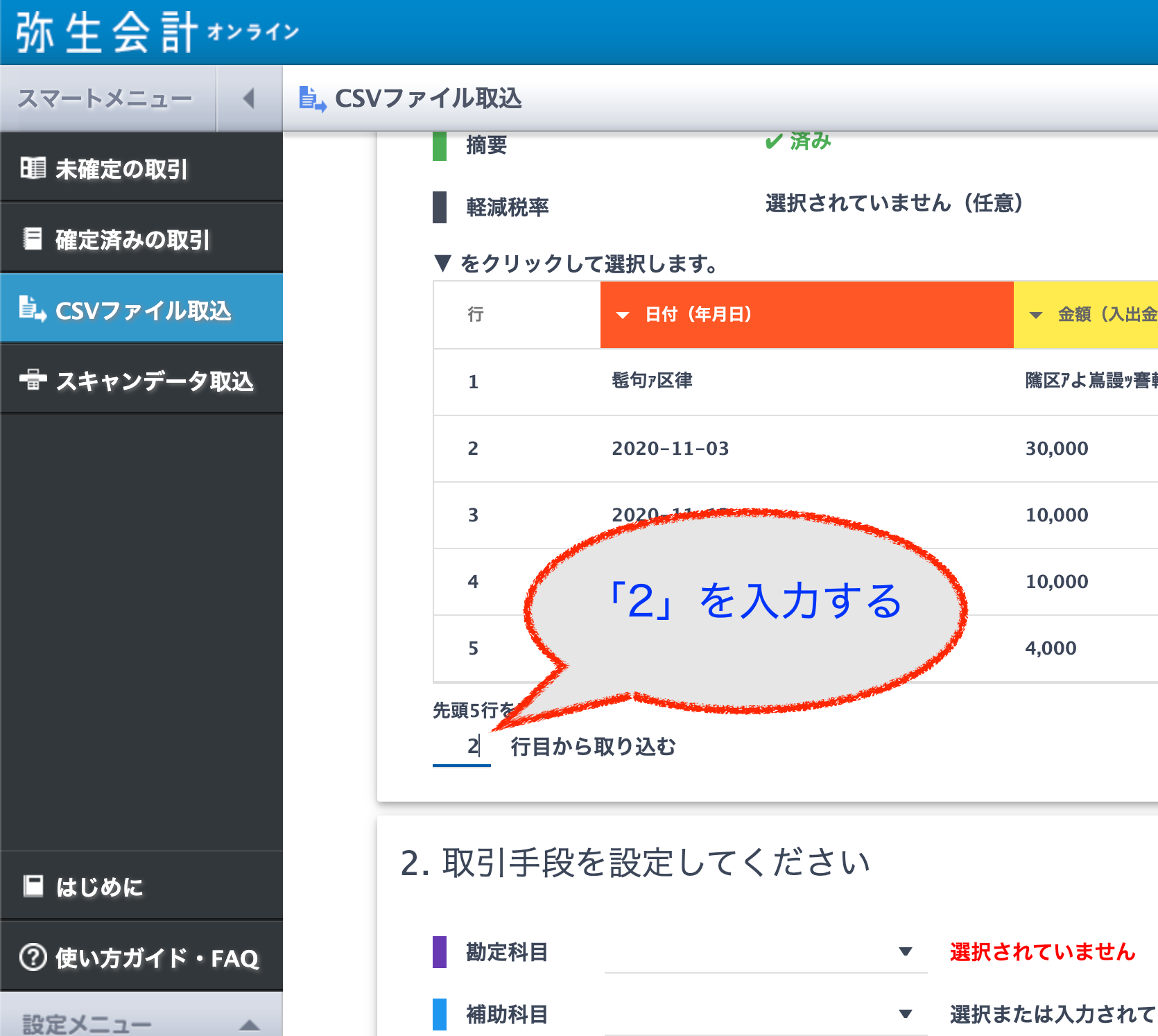 7.「〇〇行目から取り込む」の箇所に「2」を入力します。