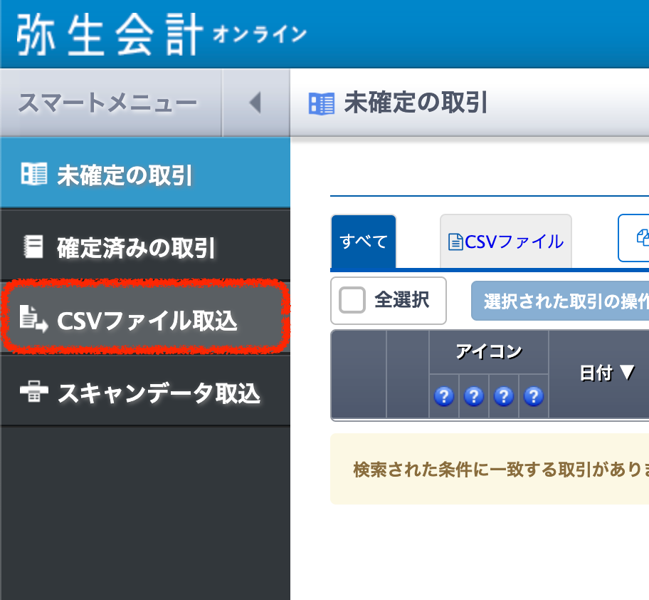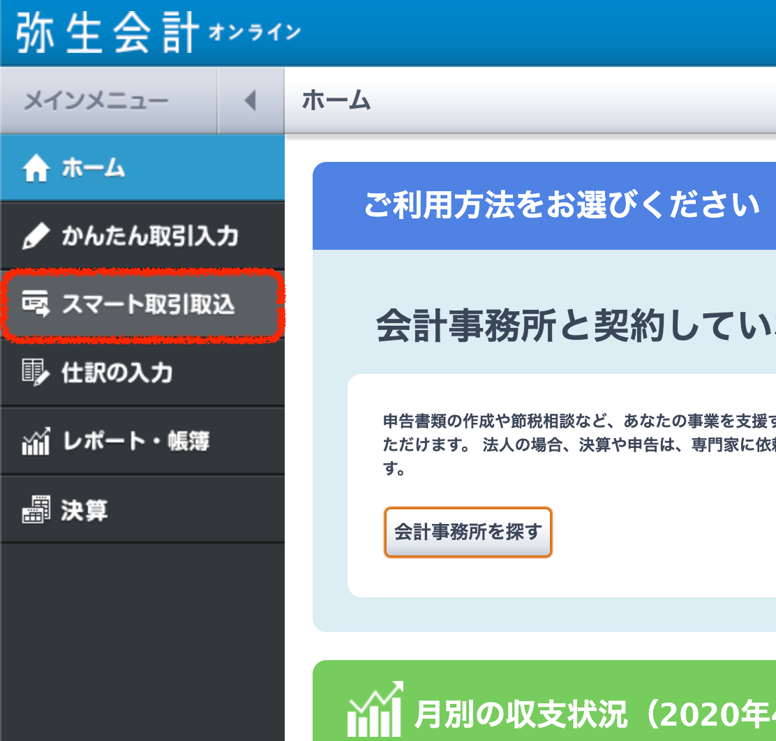 1.弥生会計オンライン管理画面で、左側にあるメニューの「スマート取引取込」をクリックします。