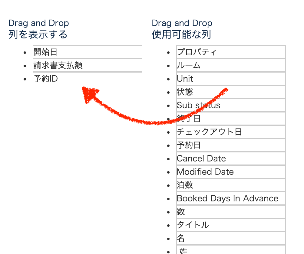 4.「列を表示する」に画像の項目をドラッグ&ドロップで設定します。