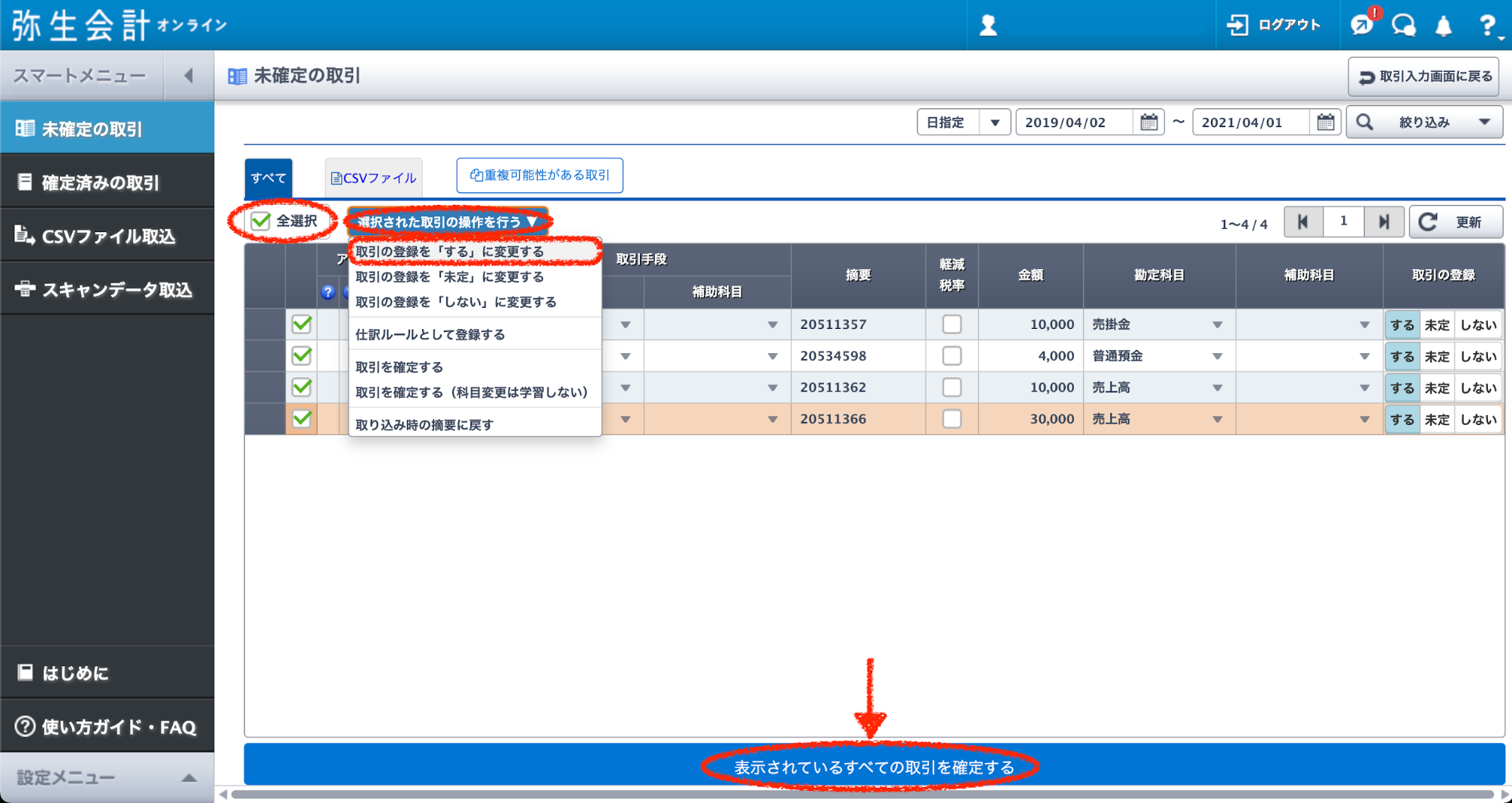 10.取り込まれたBeds24のデータに問題が無ければ、すべての取引の登録を「する」に変更し、「表示されているすべての取引を確定する」をクリックします。