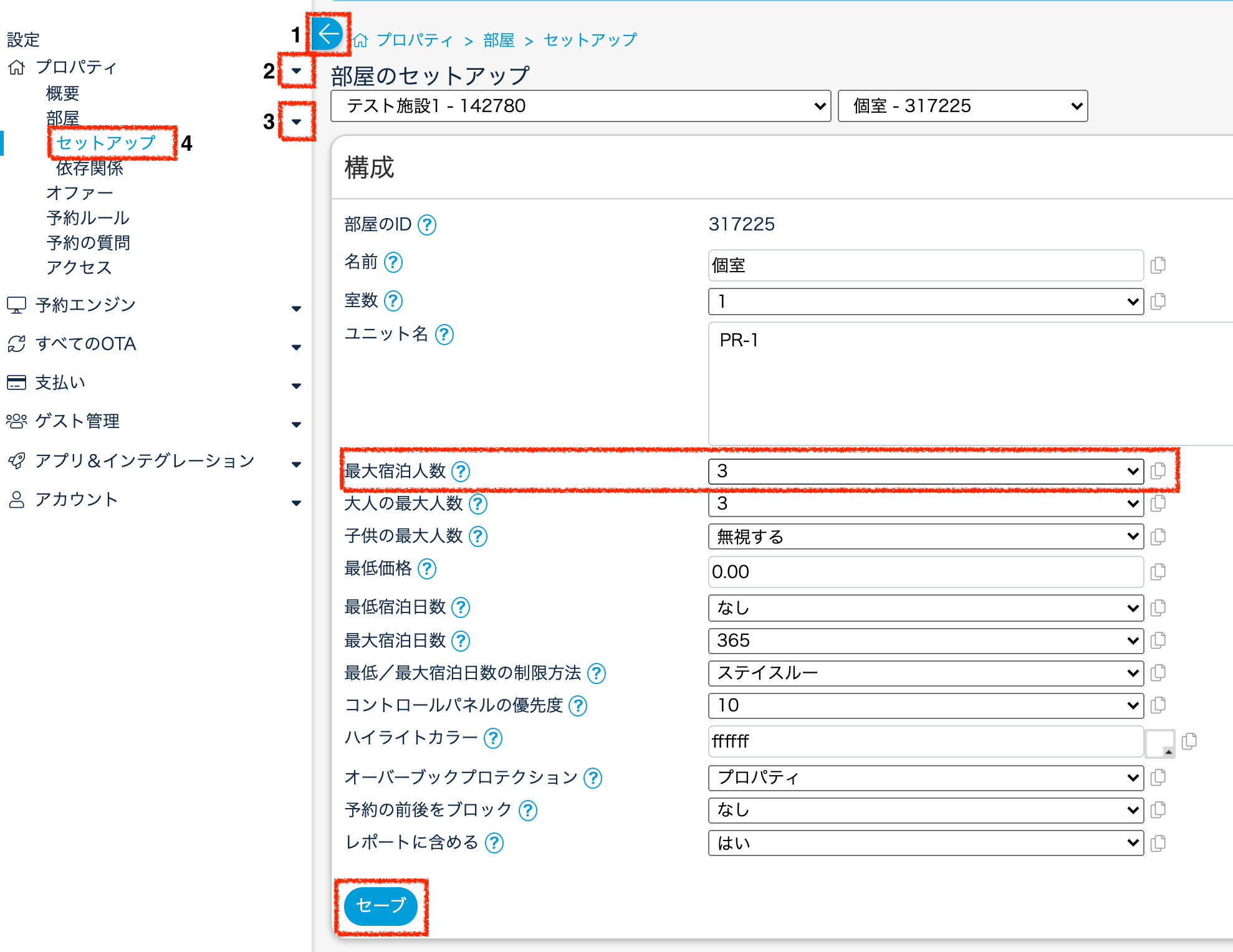 設定 > プロパティ▼ > 部屋▼ > セットアップ のページで、「最大宿泊人数」を変更してセーブしてください。