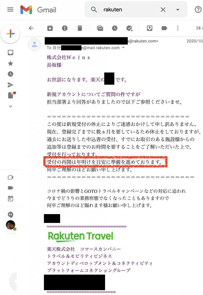 楽天トラベルの集客再開は年明けか