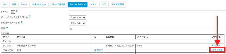 予約内の「Mail&Actions」タブ内にある該当する自動送信メールのオートアクションの[今すぐ送信]をクリックしてください。