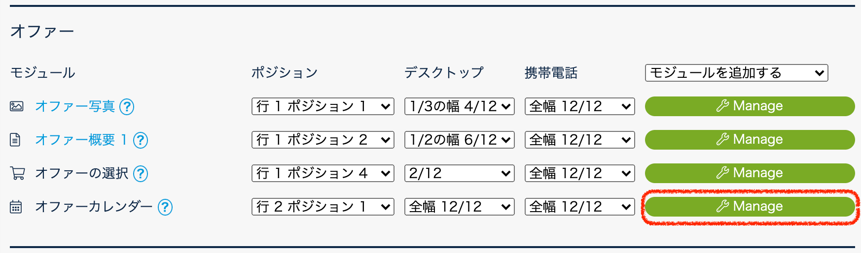 1.設定 > 予約エンジン > プロパティ予約ページ > レイアウト のオファーで、カレンダーの「Manage」ボタンをクリックします。