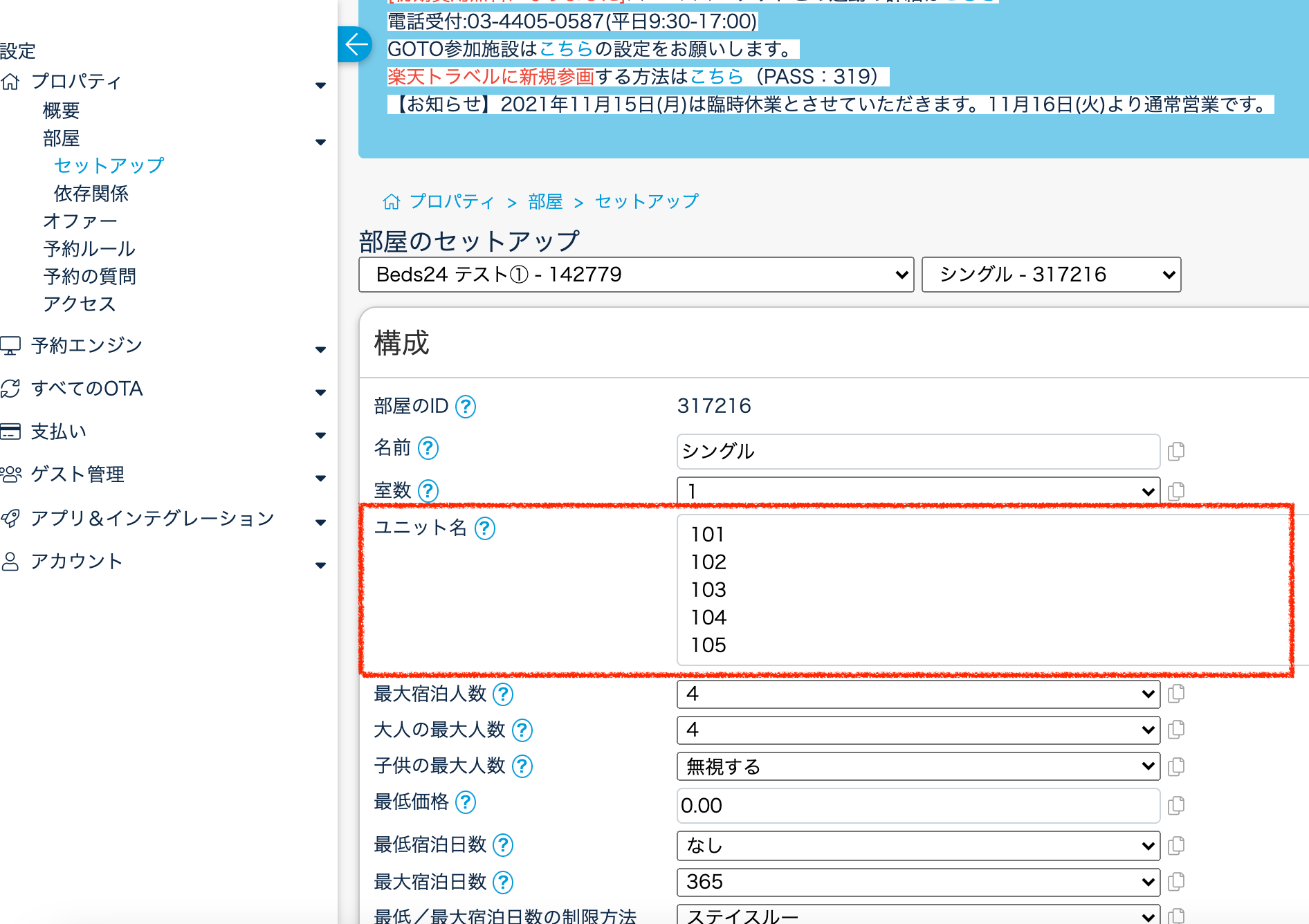 注1:ユニット名を変更しても、Beds24カレンダーの予約は移動しません。