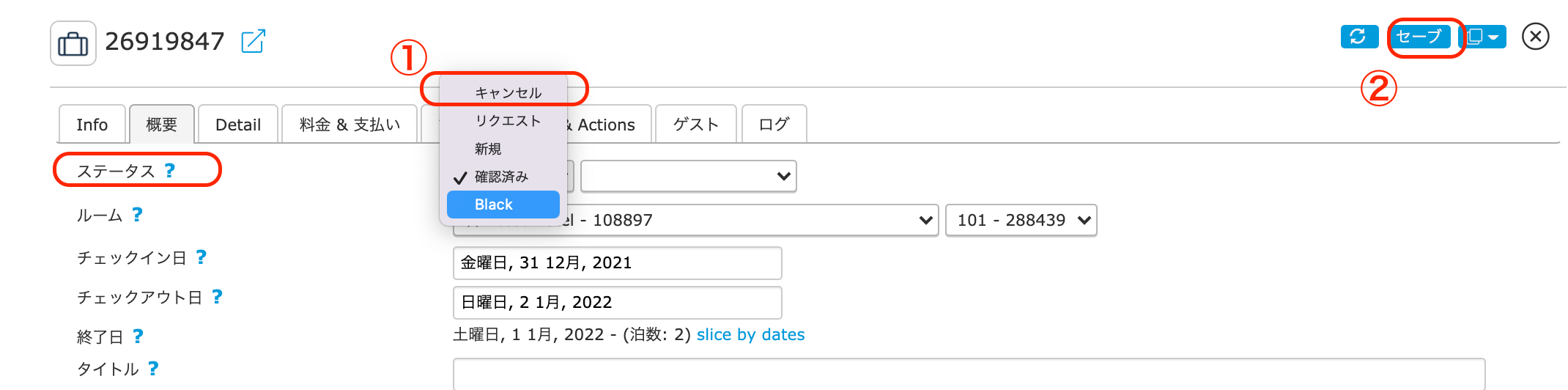 2.概要タブのステータスを「キャンセル」にしセーブをしてください。