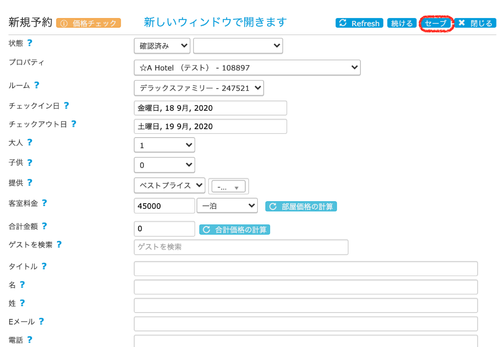 2.ポップアップウィンドウが開きます。チェックイン・チェックアウト日やゲスト名など、必要な情報を入力してください。最後にセーブボタンを押すとカレンダー上に予約が作成されます。