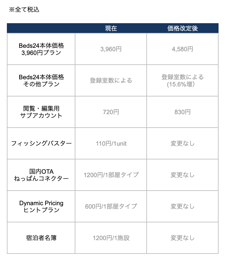 なお、宿泊者名簿や、じゃらん等の国内OTAの連動に関する費用につきましては、今回の改定の対象外となっております。