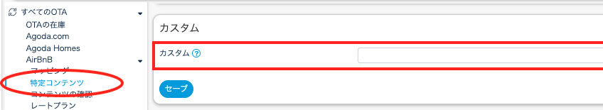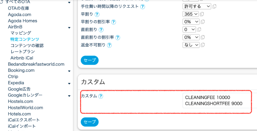 設定 > すべてのOTA > AirBnB > 特定コンテンツ > カスタムから、Airbnbで以下の料金を設定する方法です。