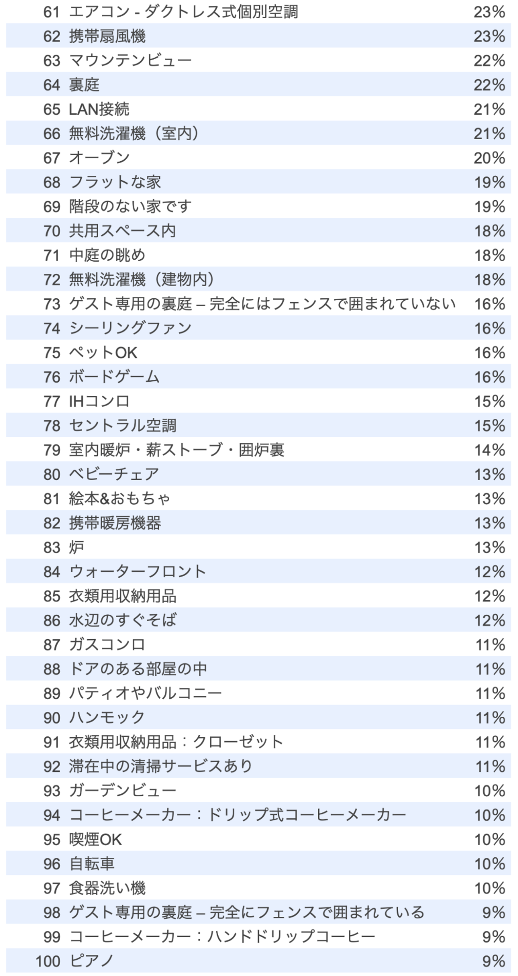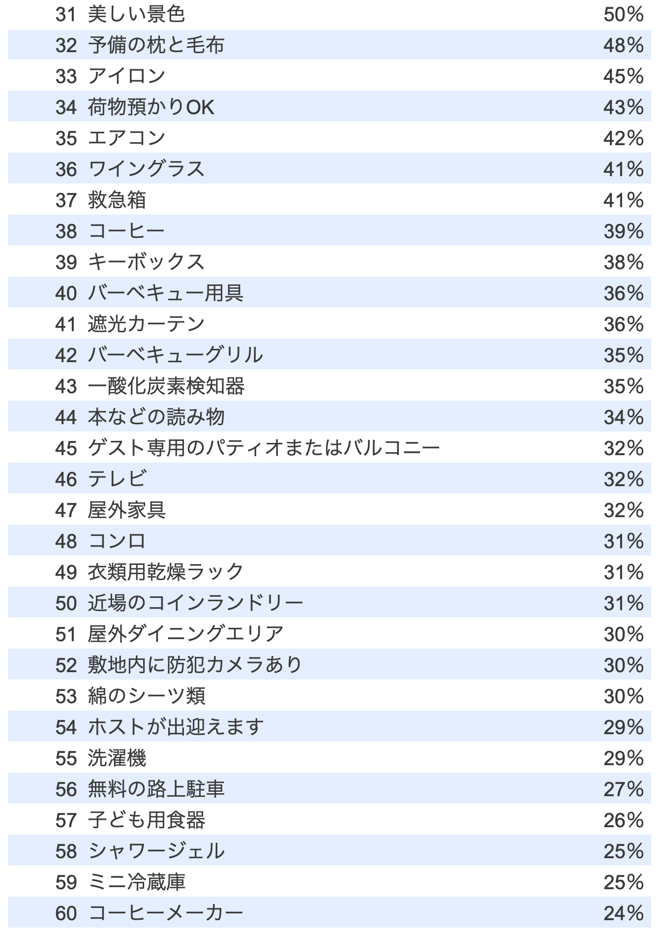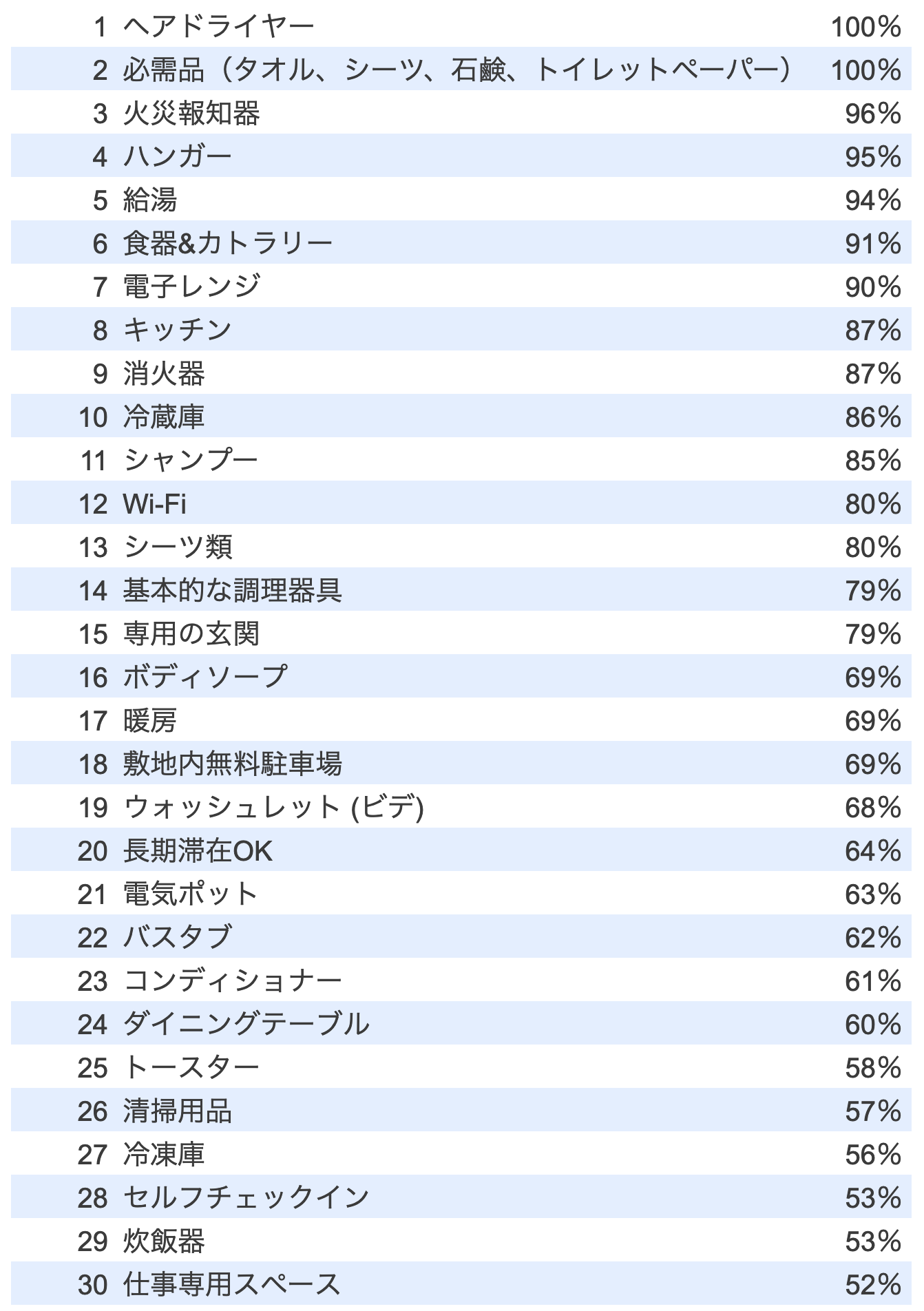 以下は、Airbnb公式で発表された人気のアメニティ・設備です。