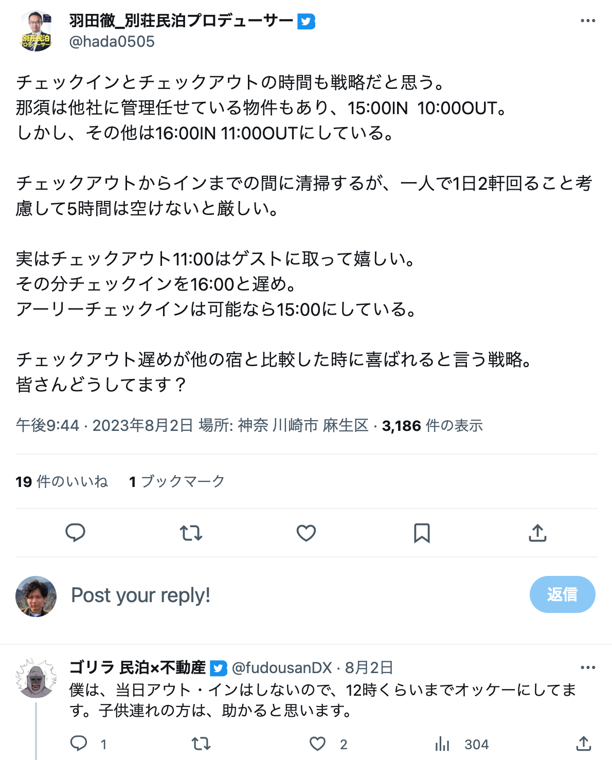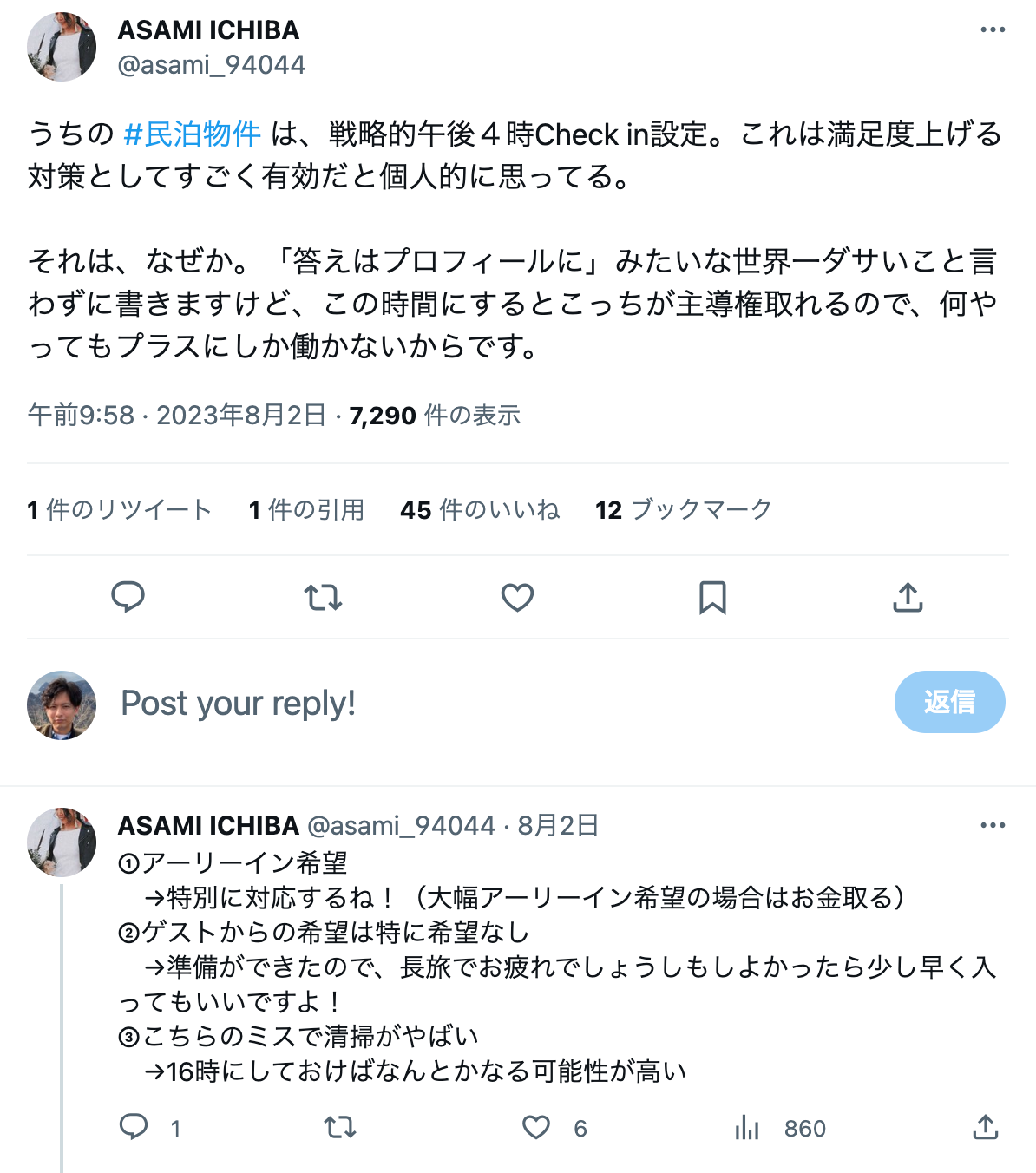 Xに投稿された、チェックイン・アウト時間のアイデアを3つ紹介します。