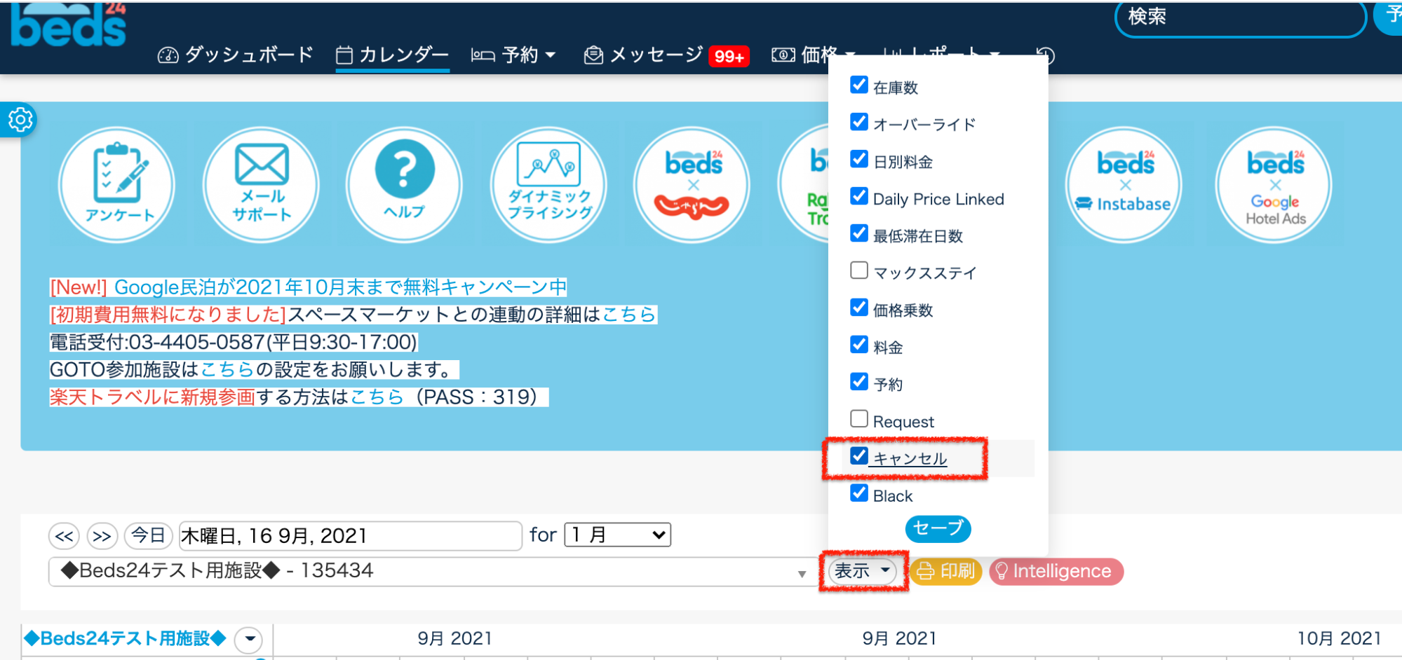Beds24カレンダーでキャンセル予約の表示・非表示を切り替えることが可能です。