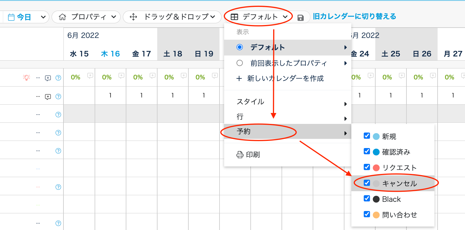 ①デフォルト>予約>キャンセルのチェックを入れると表示、チェックを外すと非表示になります。