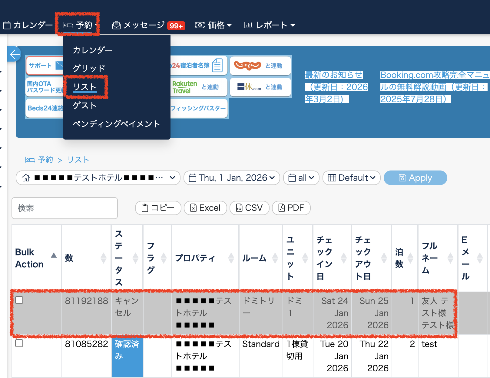 予約>リストにて、キャンセル予約を含む全予約の確認が可能です。
