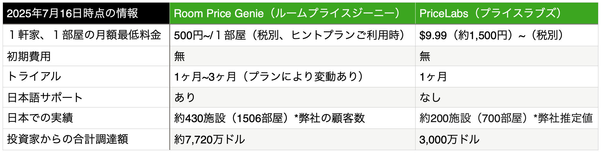 結論:現時点では、ルームプライスジーニーが優勢です。以下の比較表をみてみましょう。