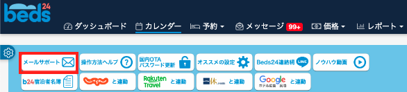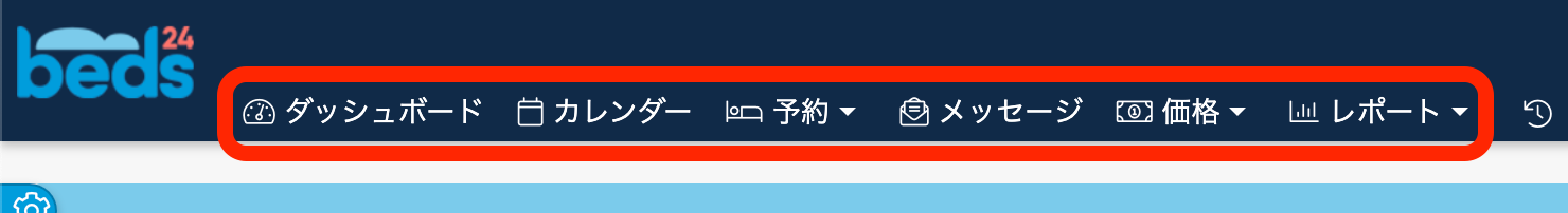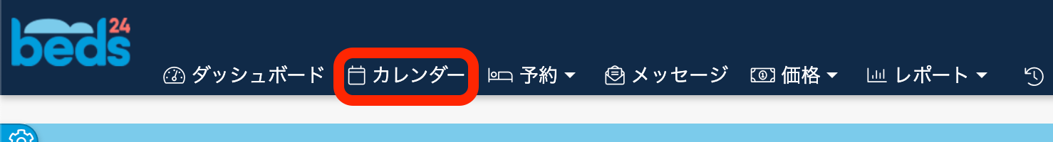 Beds24のロゴ、右側に並んでいる「ダッシュボード」「カレンダー」「予約」「メッセージ」「価格」「レポート」がメインメニューです。