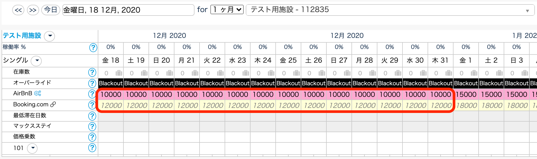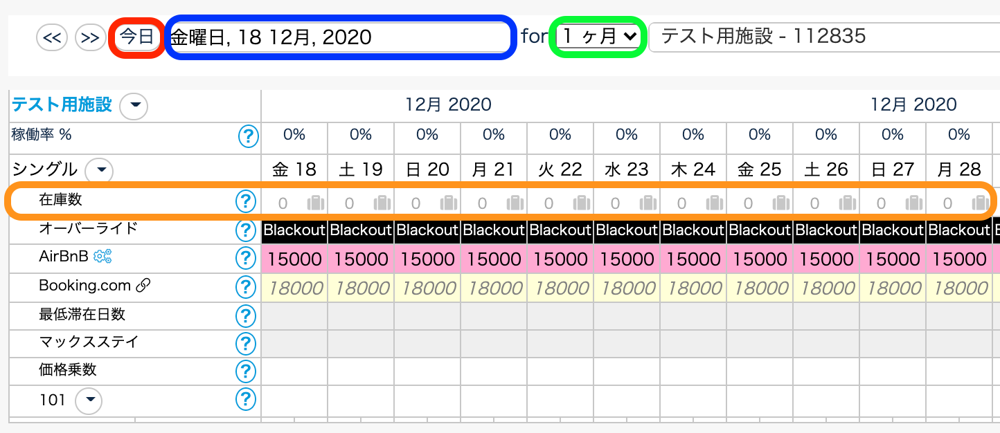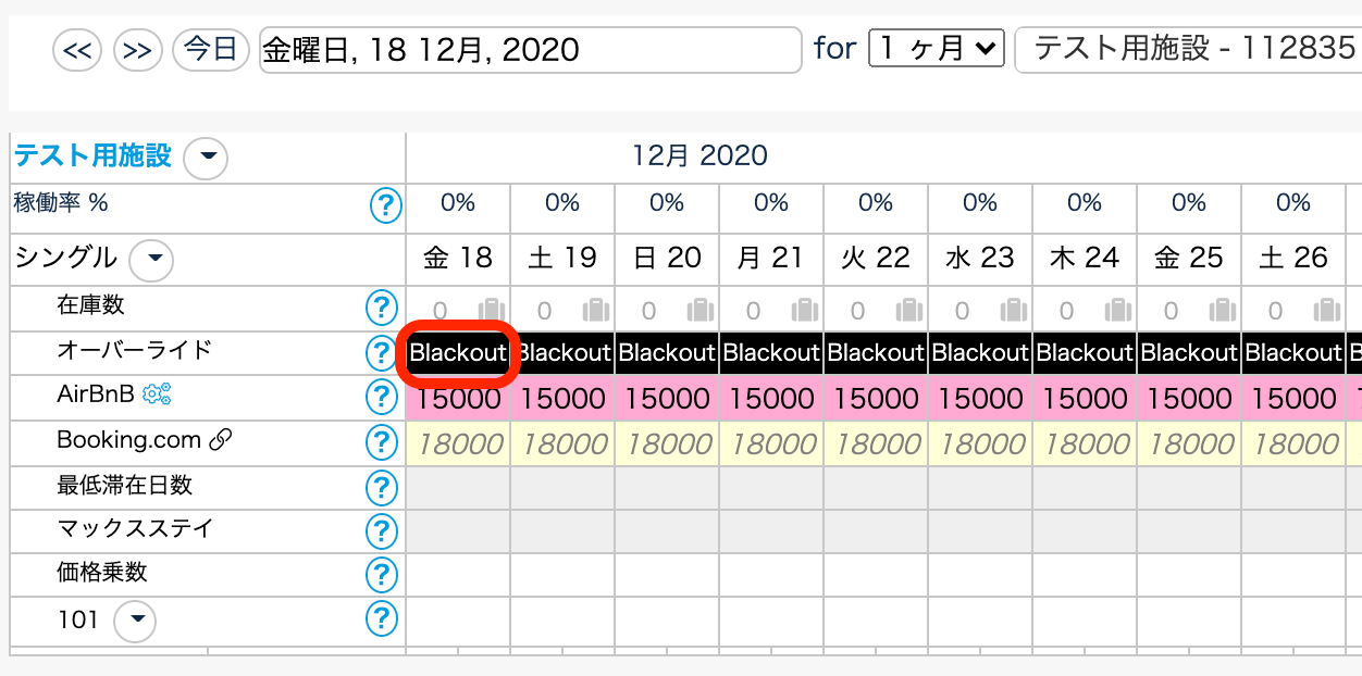 在庫の数を表示します。数字をクリックし、手動で在庫を調整することができます。オーバライドでBlackout(売り止め)を設定すると、画像の通り在庫数は0ゼロになります。※Beds24サポートにて新規物件を追加した後は、2年後の同月末日までBlackoutを設定させていただいております。