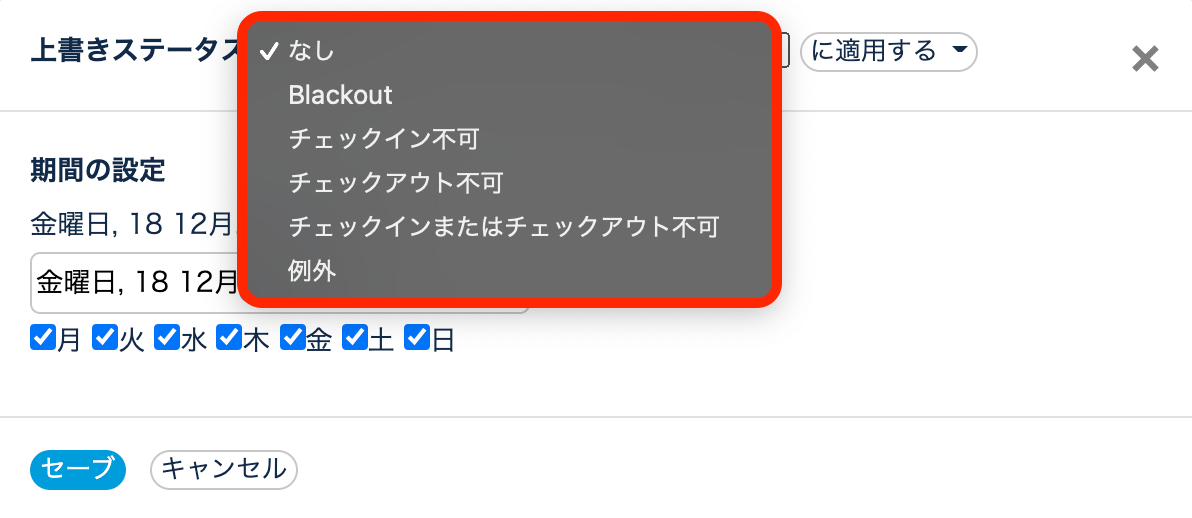 ※チェックイン不可・チェックアウト不可の設定はBooking.com、Airbnb、Expedia、Beds24の自社HPでは機能しますが、VacationSTAY・楽天トラベル・じゃらんなど一部OTAには機能致しません。詳しくはこちら