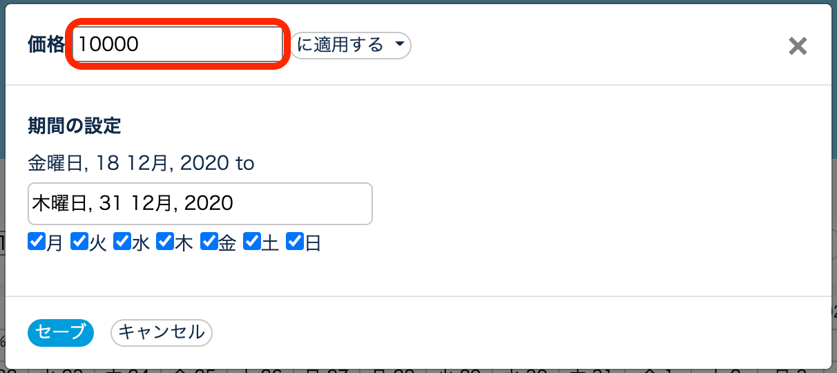 OTAに流す日々の価格を入力します。カレンダーで入力する価格は基本料金です。人数売りを実施している場合は、こちらのヘルプを参考に追加料金を設定します。