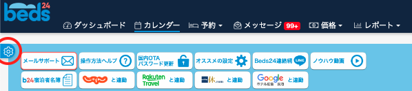 Beds24のロゴの下にある小さな歯車は、設定メニューです。