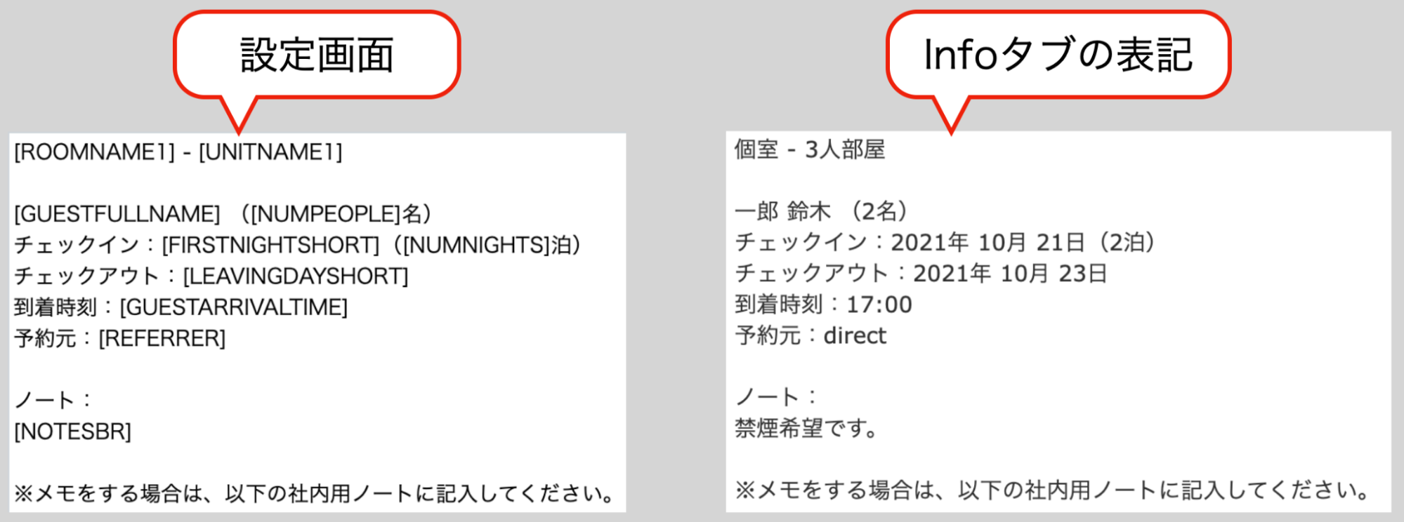 変数は以下のように、予約情報を元にテキストに変換されます。