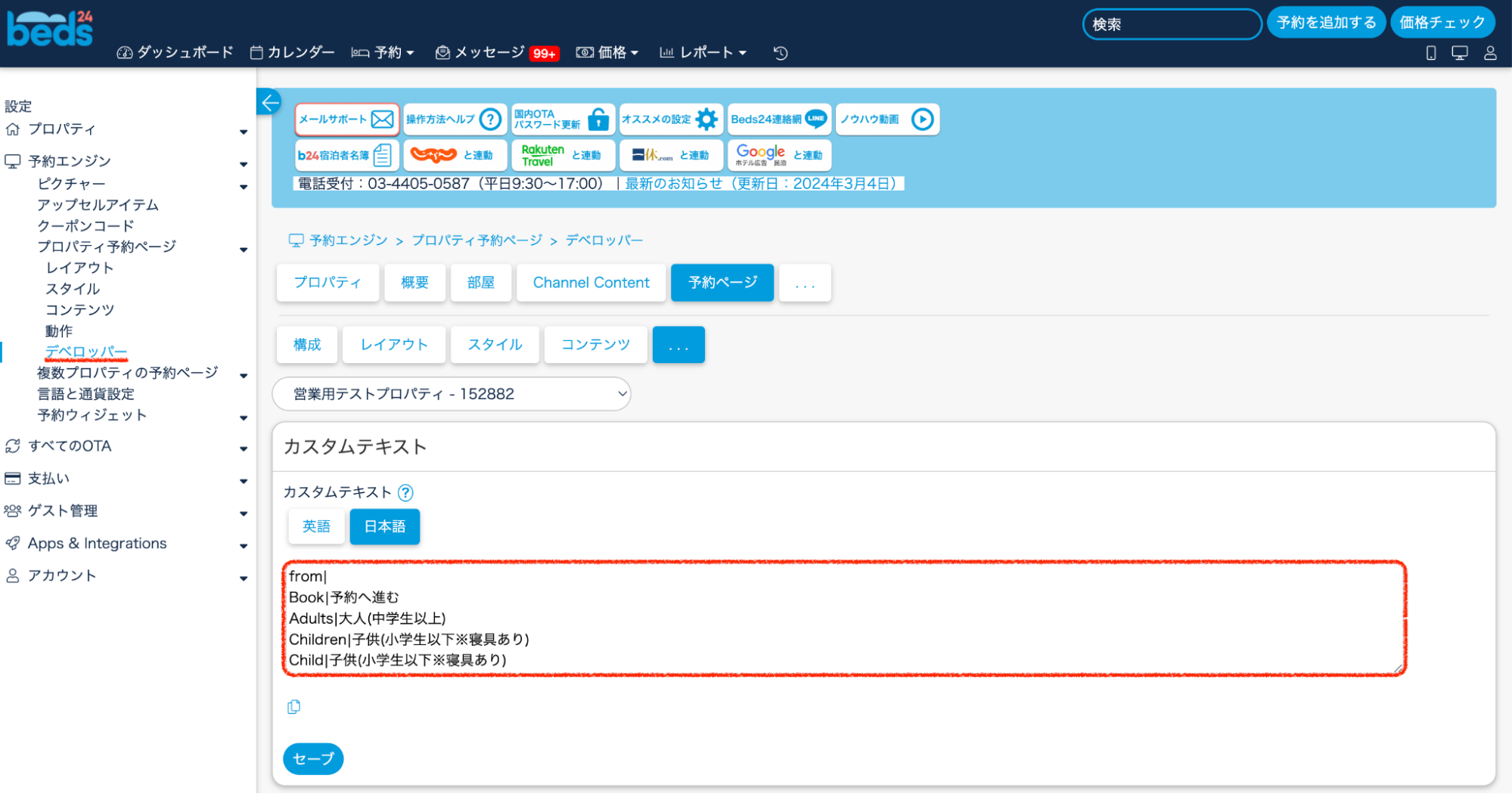 予約エンジン > プロパティ予約ページ > デベロッパー