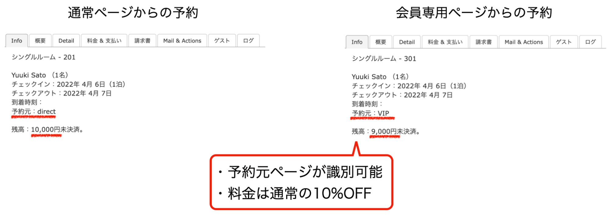 通常ページ、会員ページの予約の識別