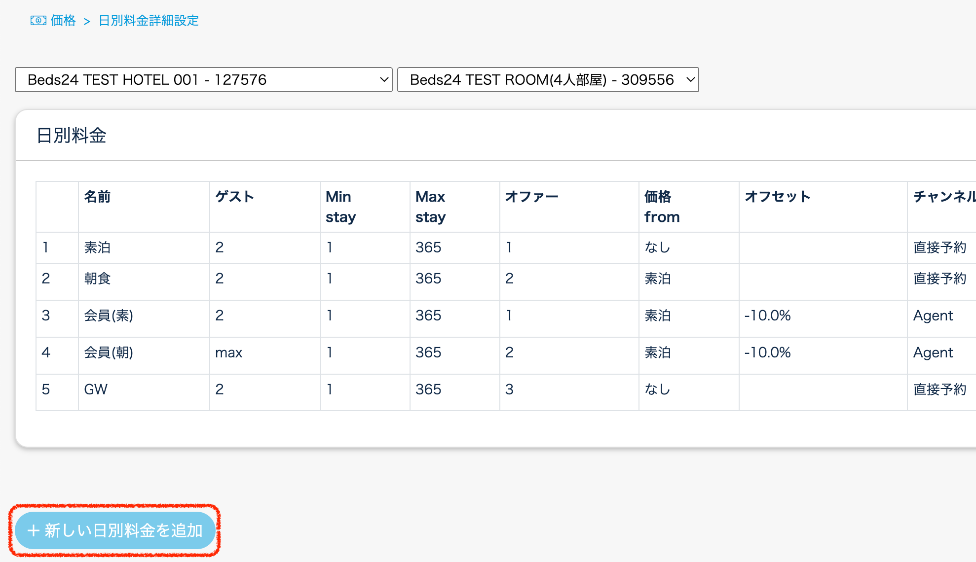 ※既存の日別料金の『beds24.com – 代行業者』のチェックは外す。